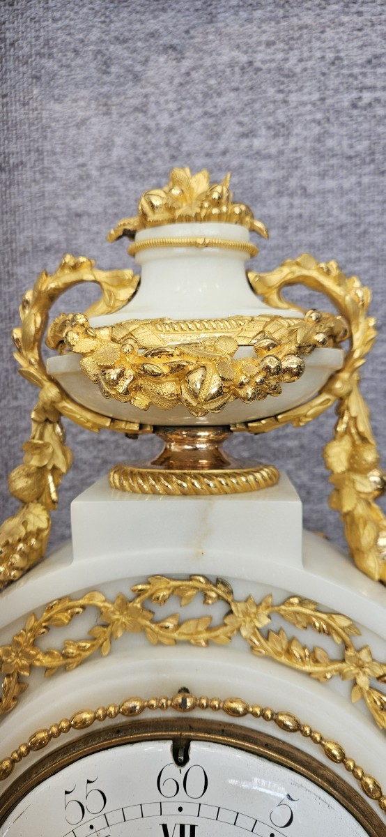 Le cadran en émail blanc présente des chiffres romains pour les heures et arabes pour les minutes, avec des aiguilles en laiton doré finement ouvragées. Il est entouré d'une frise perlée et d'un encadrement de guirlandes florales dorées. Le tout est surmonté d’un vase ornemental en marbre et bronze doré, entouré de guirlandes suspendues, un élément décoratif typique de l'époque Louis XVI.