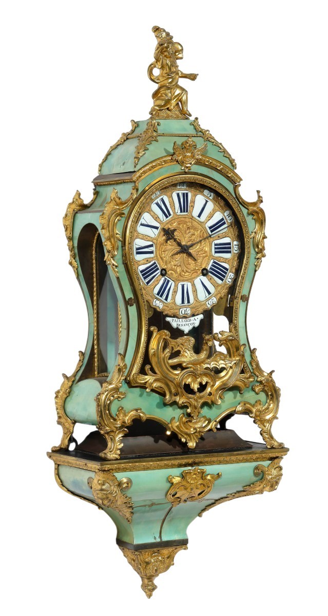 Remarquable exemple de l'art horloger rococo français, cette belle pendule de cartel et sa console murale assortie sont l'œuvre du distingué maître horloger bisontin Paillard, établi à Besançon — première ville horlogère de France. La pièce date de l'apogée de la période Louis XV, lorsque le goût rococo pour l'ornement naturaliste exubérant et les couleurs vives atteignit son zénith créatif.