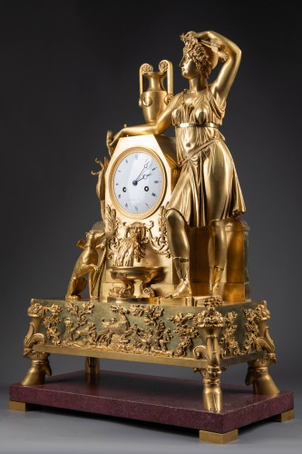 Importante pendule en bronze finement ciselé et doré figurant Diane chasseresse.
