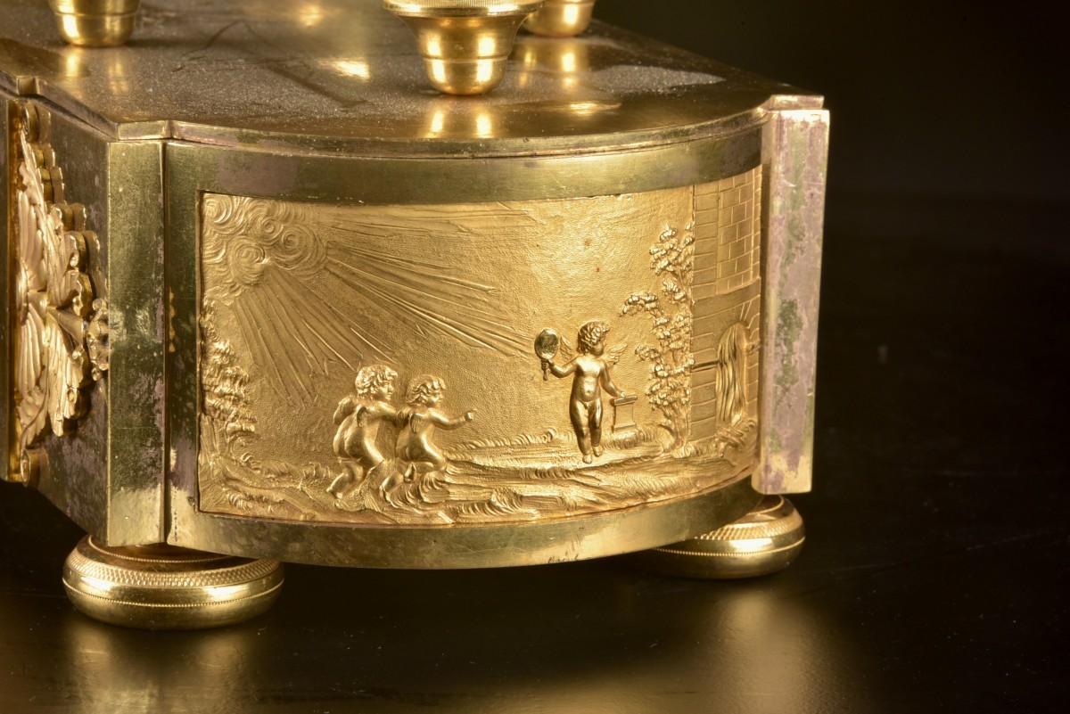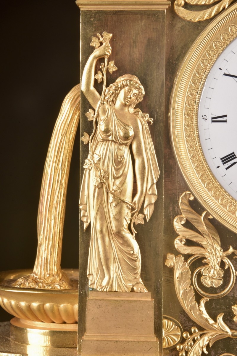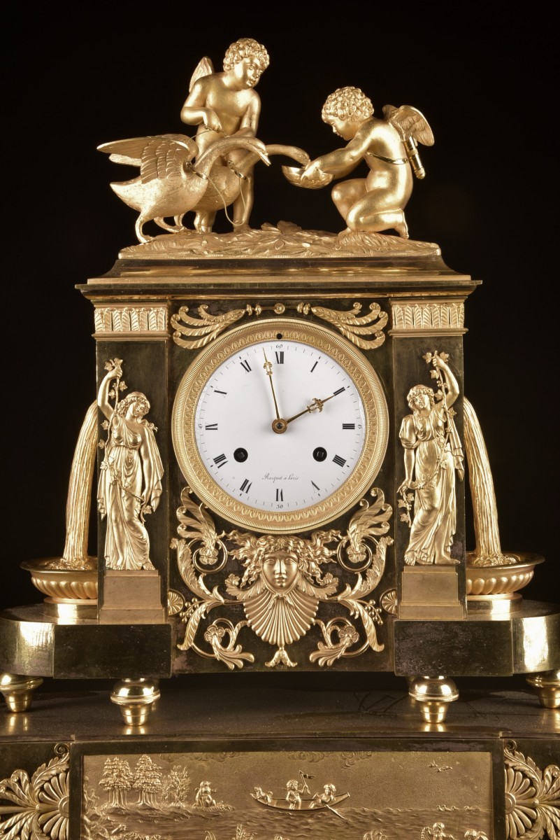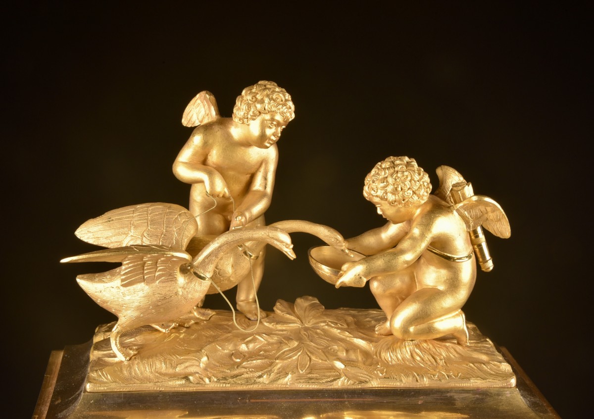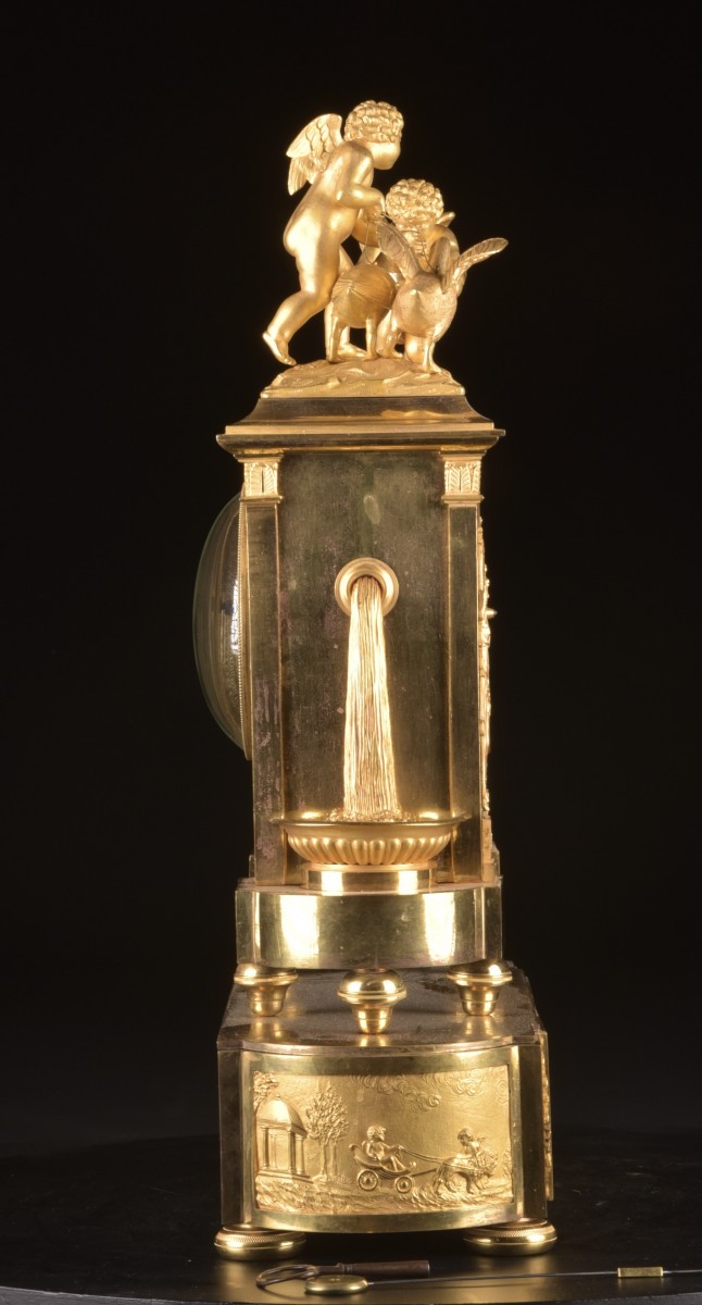 Importante pendule française en bronze doré, réalisée à Paris durant la période de transition Louis XVI – début Empire (vers 1800–1810). Le boîtier, d’architecture rigoureusement symétrique, est richement orné de bronzes finement ciselés d’une grande qualité d’exécution. Le couronnement est composé d’un groupe sculptural représentant deux amours et un cygne, allégorie classique de l’innocence, de la nature et du passage du temps. De part et d’autre du cadran se tiennent des figures féminines élégantes versant de l’eau dans des coupes, inspirées des allégories de fontaines et du cycle de la vie. La base est décorée d’un large panneau en bas-relief figurant une scène paysagère délicatement traitée. Le cadran en émail, à chiffres romains avec minuterie, est signé « Lepaute à Paris ». L’ensemble se distingue par son caractère monumental et représentatif, destiné à un intérieur de prestige. Dimensions