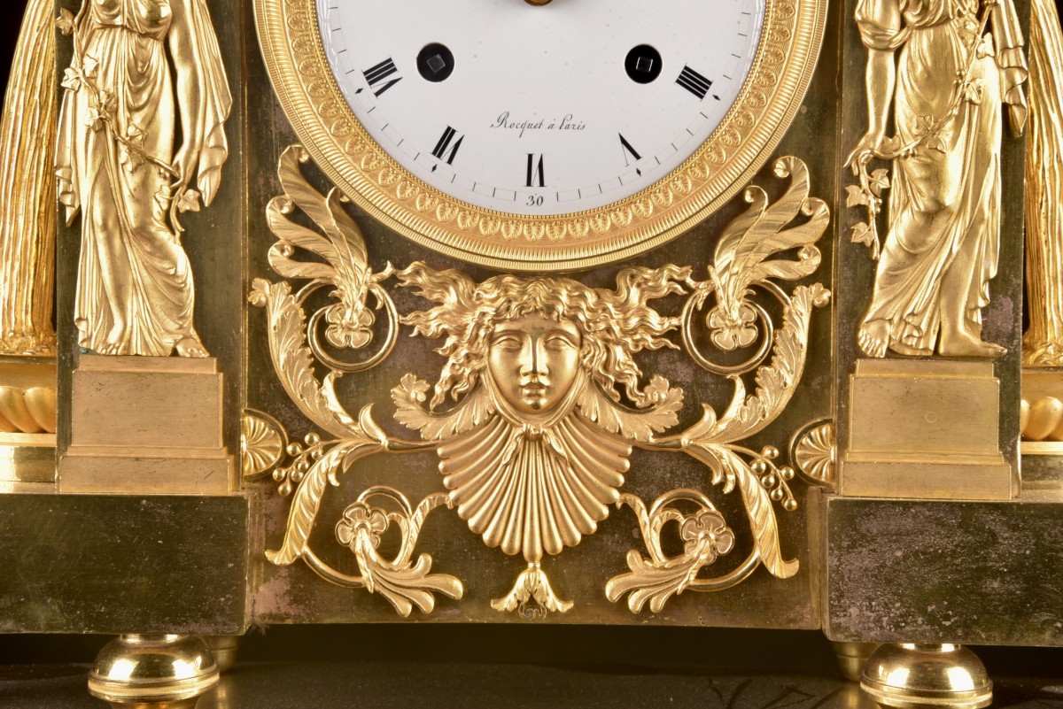 Profondeur : 15 cm L’horloger Cette pendule est attribuée à Jean-Baptiste Lepaute, l’un des horlogers parisiens les plus réputés de la fin du XVIII? siècle. Membre de la célèbre dynastie Lepaute et nommé Horloger du Roi, il fournit des pendules et mouvements de haute précision à la cour, aux institutions publiques et à une clientèle d’élite. Les œuvres signées « Lepaute à Paris » sont aujourd’hui reconnues internationalement et figurent dans des collections muséales et privées de premier plan, illustrant l’excellence de l’horlogerie française néoclassique et du début de l’Empire.