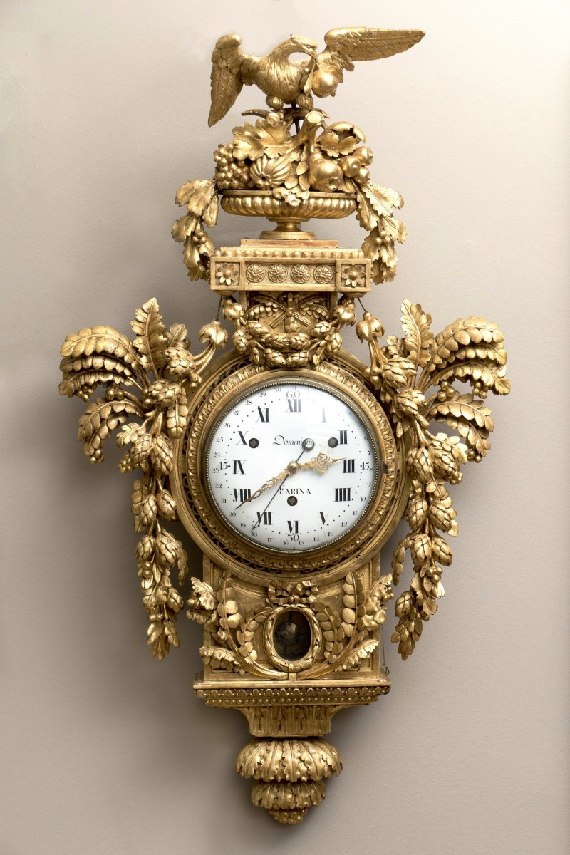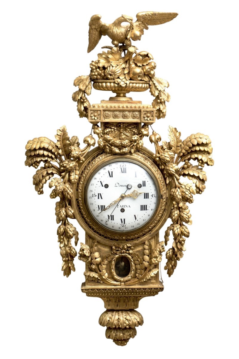 Retrouver le mobilier ou les objets d''art similaires à « Pendule cartel en bois doré » présenté par Galleria Silva, antiquaire à Milano dans la catégorie Cartel Louis XVI, Horlogerie.