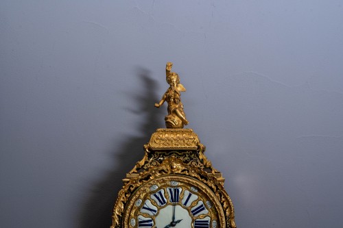 L'une de ses horloges les plus remarquables, qu'il inventa en 1727, indiquait le temps vrai et le temps médian sur quatre cadrans et affichait des indications astronomiques sur un cinquième cadran. Au moment de la mort de Martinot, cette horloge appartenait au peintre, graveur, commentateur d'art et dramaturge Charles Coypel et fut ensuite acquise par l'horloger Julien Le Roy. En écrivant sur cette horloge, Le Roy note que Martinot "ayant préparé un dessin pour une horloge d'équation, sans défaut de celles qui s'ouvrent au centre du cadran, eut l'idée de se servir de l'idée de M. Le Bon d'une horloge sans clef. Martinot fit la sienne de telle sorte que le cadran, la plaque et l'aiguille des minutes s'élèvent et s'abaissent réellement par le moyen de l'ellipse". L'horloge elle-même était logée dans un cadre en bronze doré conçu par le célèbre artiste et orfèvre Juste-Aurèle Meissonnier (1695-1750), connu pour ses créations rococo exubérantes. Outre ses propres coffrets, Martinot a également utilisé ceux des ébénistes Charles Cressent et André-Charles Boulle. Parmi les exemples de ce dernier, citons une horloge de cheminée de la Wallace Collection, à Londres, qui porte l'inscription C. Martinot Galleries du Louvre sur la plaque arrière du mouvement. 1726. La pendule de la Wallace Collection est logée dans un somptueux boîtier d'André-Charles Boulle et présente la figure de l'Amour à son sommet et celle du Père Temps sous le cadran. Le présent boîtier est certainement de la même qualité, du même style et de la même conception que l'œuvre de Boulle et pourrait très bien être l'œuvre du maître lui-même.