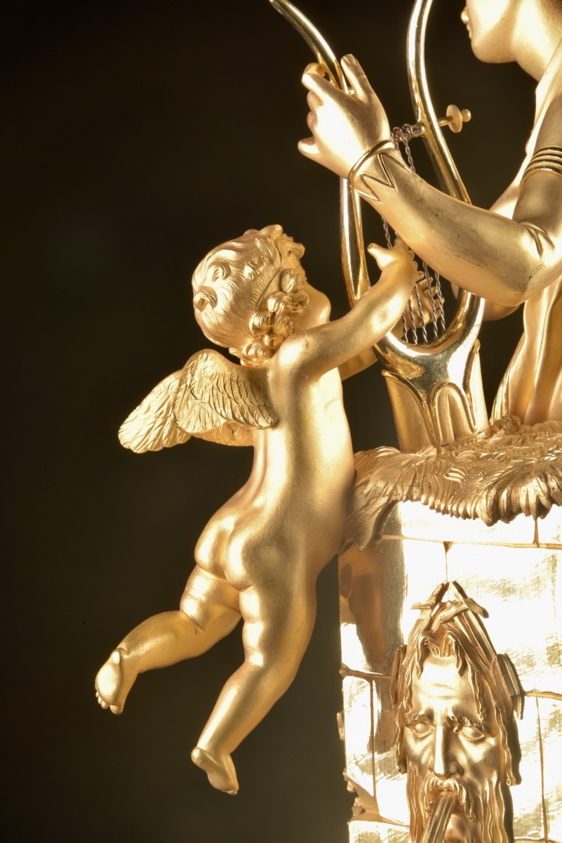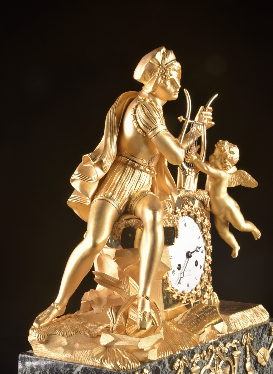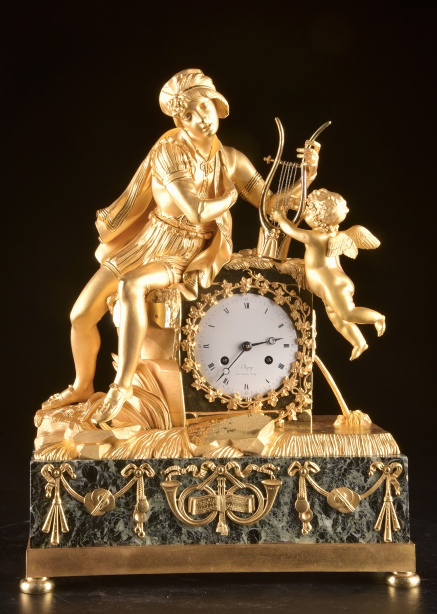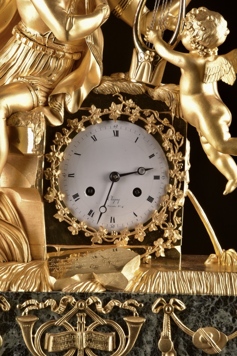 Cette pendule Empire en bronze doré représente un jeune troubadour jouant de la lyre, accompagné d’un Amour ailé. La caisse est exécutée en bronze doré au feu et repose sur une base en marbre verde antico. Le cadran émaillé est signé Chapuy, Rue Vivienne N°4, horloger parisien actif au début du XIX? siècle. Le modelé raffiné et l’iconographie musicale présentent de fortes affinités avec les créations du bronzier renommé Claude Galle (1759–1846). Un modèle comparable, signé Galle, a été présenté dans une vente chez Christie’s Londres (The Connoisseur’s Library Sale, février 2023). Sur la façade, une inscription poétique est gravée :