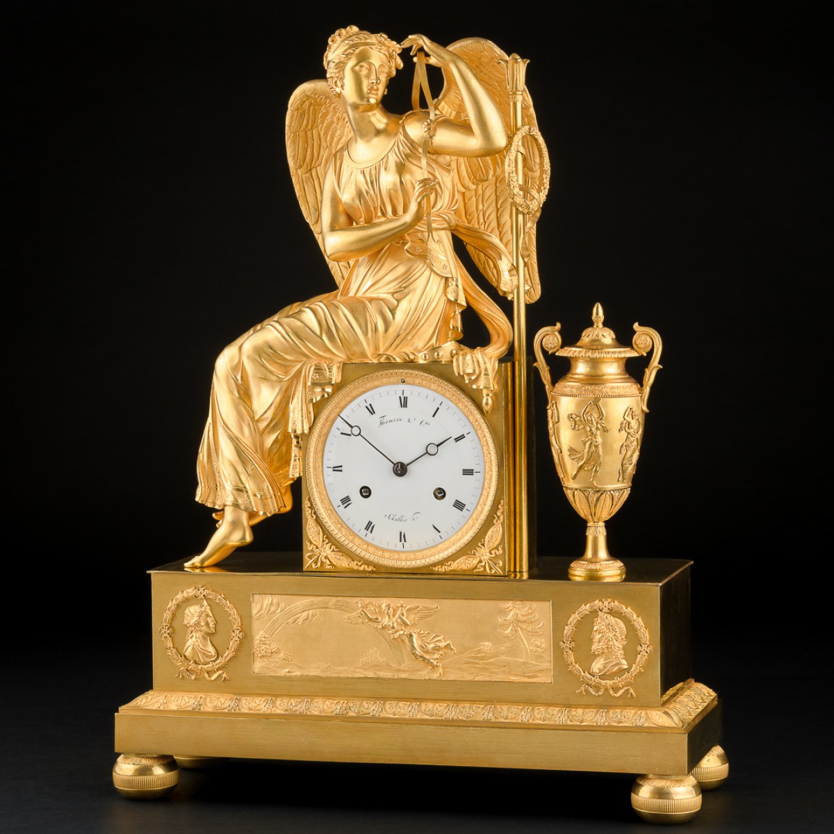 Exécutée en bronze doré au mercure finement coulé d’une qualité exceptionnelle, cette horloge reste en excellent état. Un exemple rare et superbe de l’un des meilleurs bronziers d’époque Empire, elle illustre l’élégance, le raffinement et l’ambition artistique de son époque.