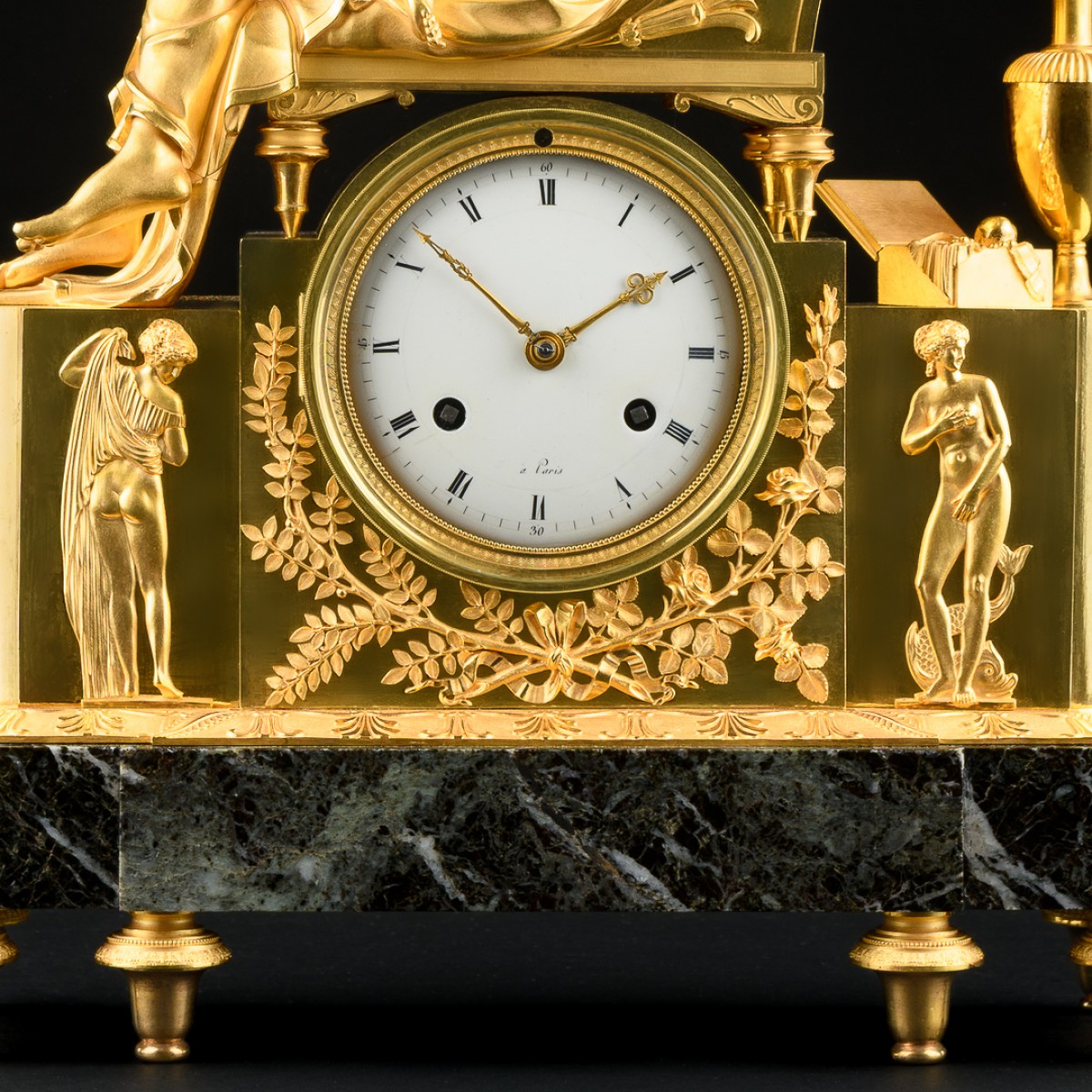 Une pendule Empire exceptionnellement raffinée et rare en bronze doré, exécutée entièrement en dorure au mercure mate et brunie, reposant sur une base en marbre vert de mer magnifiquement veiné. Cette remarquable pendule française du début du XIXe siècle présente une superbe composition mythologique représentant Vénus désarmant avec espièglerie son fils l’Amour, rendue avec une grande délicatesse et raffinement. Dans l’art du XVIIIe siècle, le châtiment de l’Amour était souvent confié à sa mère, Vénus, qui employait divers moyens charmants mais symboliques pour le maîtriser. En confisquant son arc et ses flèches, elle privait le malicieux dieu de l’amour de son pouvoir de blesser les cœurs mortels, freinant momentanément sa tyrannie enjouée sur ses victimes sans méfiance.