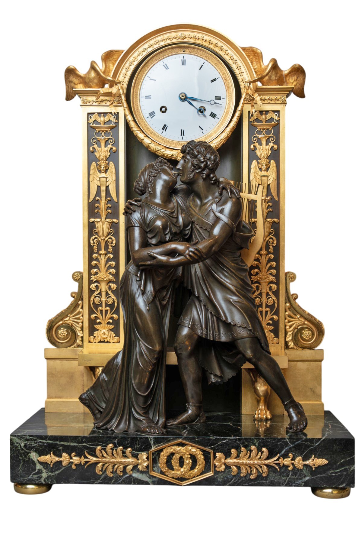 Rare et prestigieuse pendule en bronze patiné et bronze doré au mercure, représentant le célèbre groupe sculpté « La Réconciliation », modèle emblématique du bronzier Claude Galle (1759–1815), l’un des plus grands maîtres bronziers de l’époque Empire. La composition met en scène un couple antique enlacé, traité avec une remarquable qualité de modelé et une grande finesse anatomique. Les drapés fluides, les attitudes naturelles et l’expressivité des visages confèrent à l’ensemble une forte charge émotionnelle, directement inspirée de la statuaire néoclassique et de la sculpture antique. Le groupe est disposé devant une architecture monumentale formant la caisse de la pendule, richement décorée de lyres, aigles impériales, palmettes, rinceaux et frises de feuillages, surmontée d’un cadran circulaire en émail blanc à chiffres romains. L’ensemble repose sur une base en ...