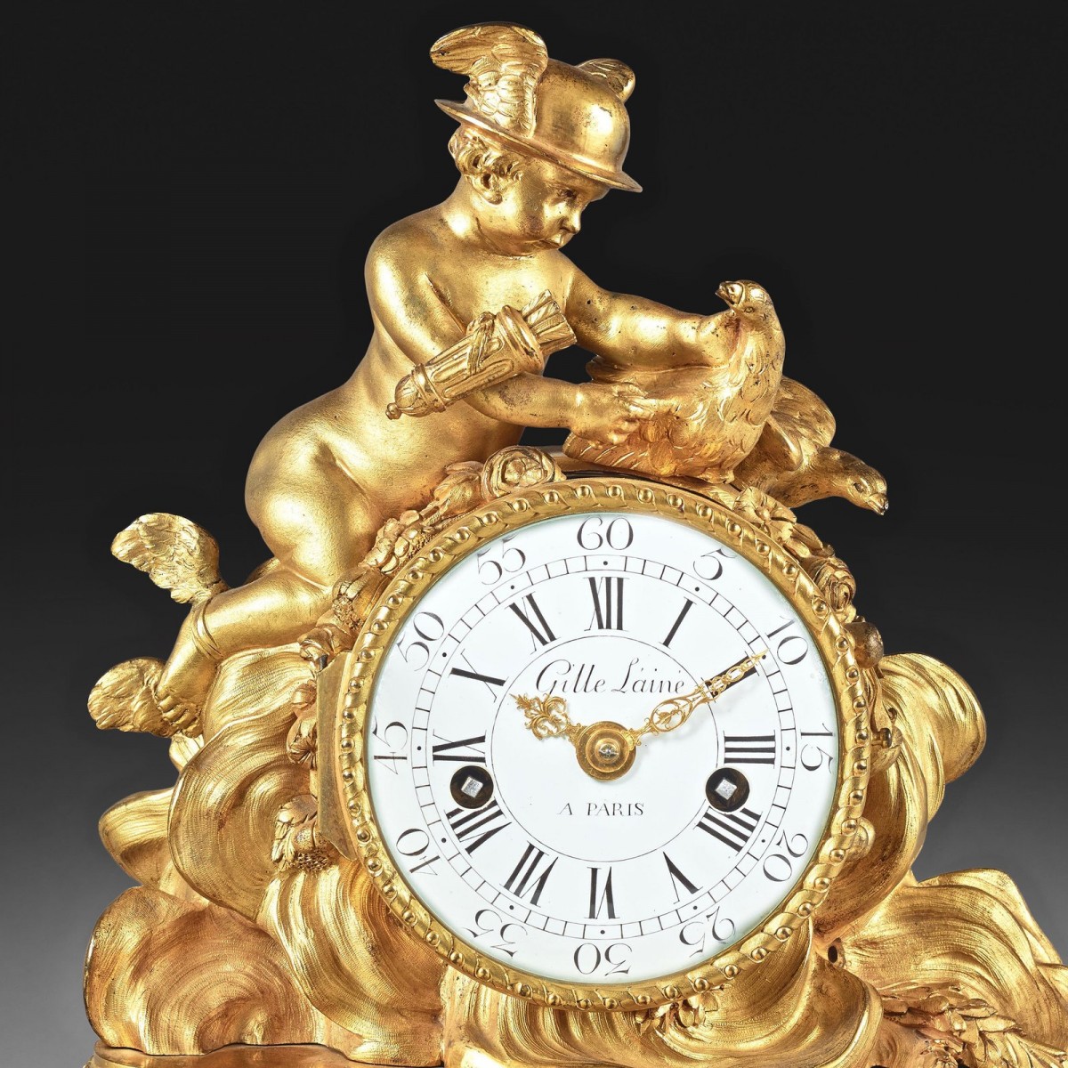 Cette pendule de bureau en bronze ciselé et doré représente un amour ailé caressant l’un des oiseaux d’un couple de colombes. Portant un casque ailé, des ailes sont également accrochées à ses chevilles au moyen d’un lacet de même qu’un carquois sur son bras droit. Il émerge d’un nuage devant lequel prend place un cadran émaillé blanc, à chiffres romains pour les heures et arabes pour les minutes, et signé « Gille L’ainé à Paris », encadré d’une frise d’entrelacs et surmontée d’une guirlande de fleurs.
