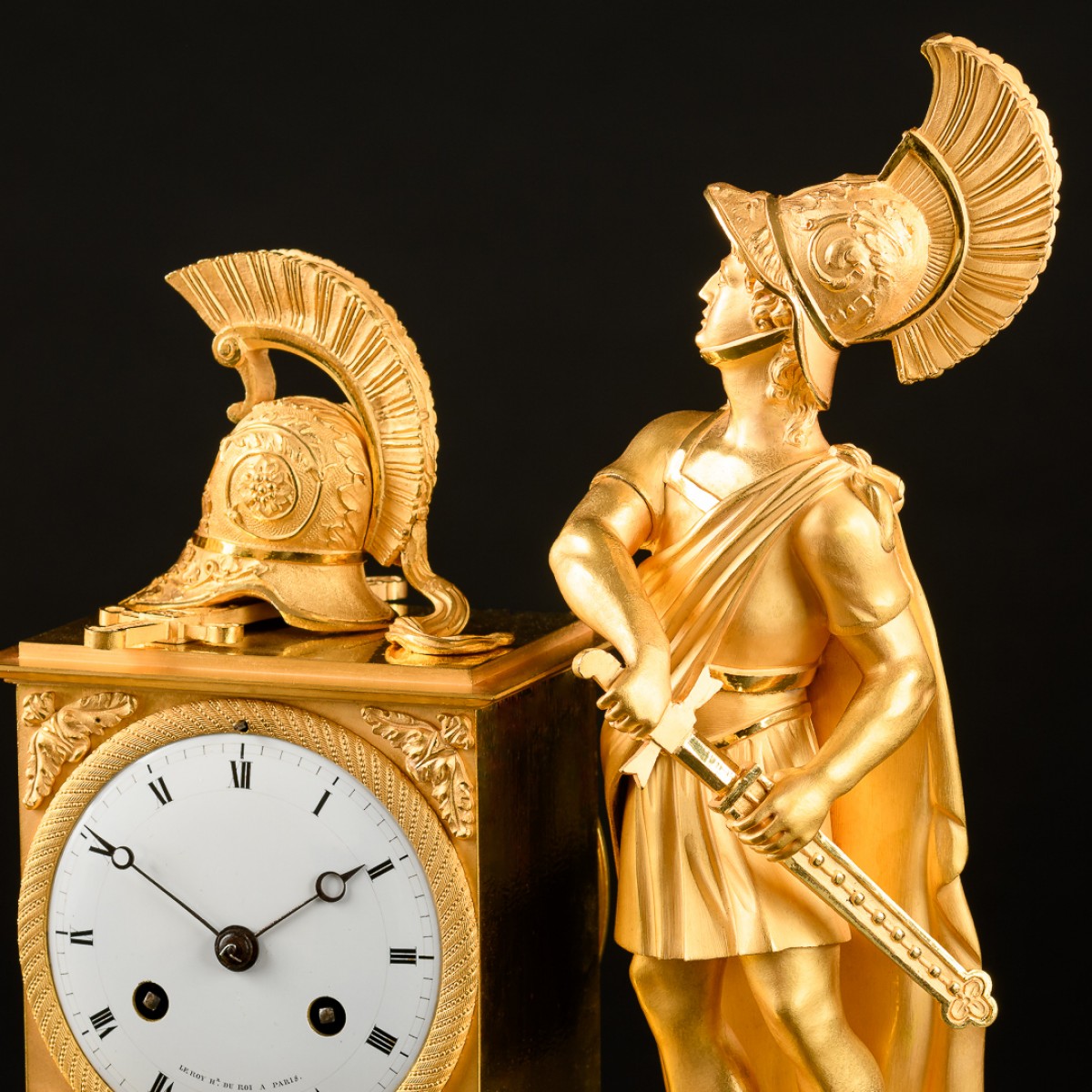 Cette grande pendule mythologique Empire, d’après le dessin d’André-Antoine Ravrio, représente l’affrontement d’Achille et d’Agamemnon au sujet du sacrifice d’Iphigénie. Sur le côté droit, on voit Achille, jeune soldat casqué, rengainant son épée, et sur le côté gauche, on voit un Agamemnon barbu en toge, les bras croisés. En outre, le bas-relief du socle représente une scène de sacrifice. Entre Achille et Agamemnon, le cadran de la pendule est inscrit dans une stèle surmontée d’une épée et d’un casque. Le cadran porte la signature “Le Roy Hr du Roi – à Paris” qui fait référence au célèbre horloger Bazile-Charles Le Roy.