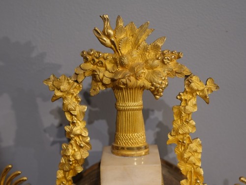 Retrouver le mobilier ou les objets d''art similaires à « Pendule portique Directoire en marbre et bronzes dorés » présenté par Gérardin et Cie, antiquaire à Lyon dans la catégorie Pendule Directoire, Horlogerie.