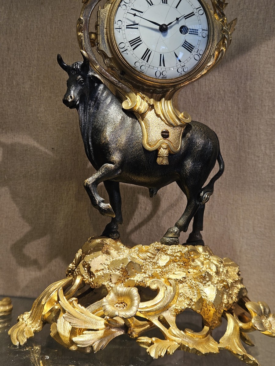 Élégante et rare pendule de table en bronze ciselé, patiné et doré au mercure, représentant un taureau au naturel, traité avec force et réalisme, reposant sur une base rocaille richement ajourée. L’animal, figuré dans une attitude dynamique, une patte levée, se distingue par un modelé souple et vivant, caractéristique du goût naturaliste du règne de Louis XV.