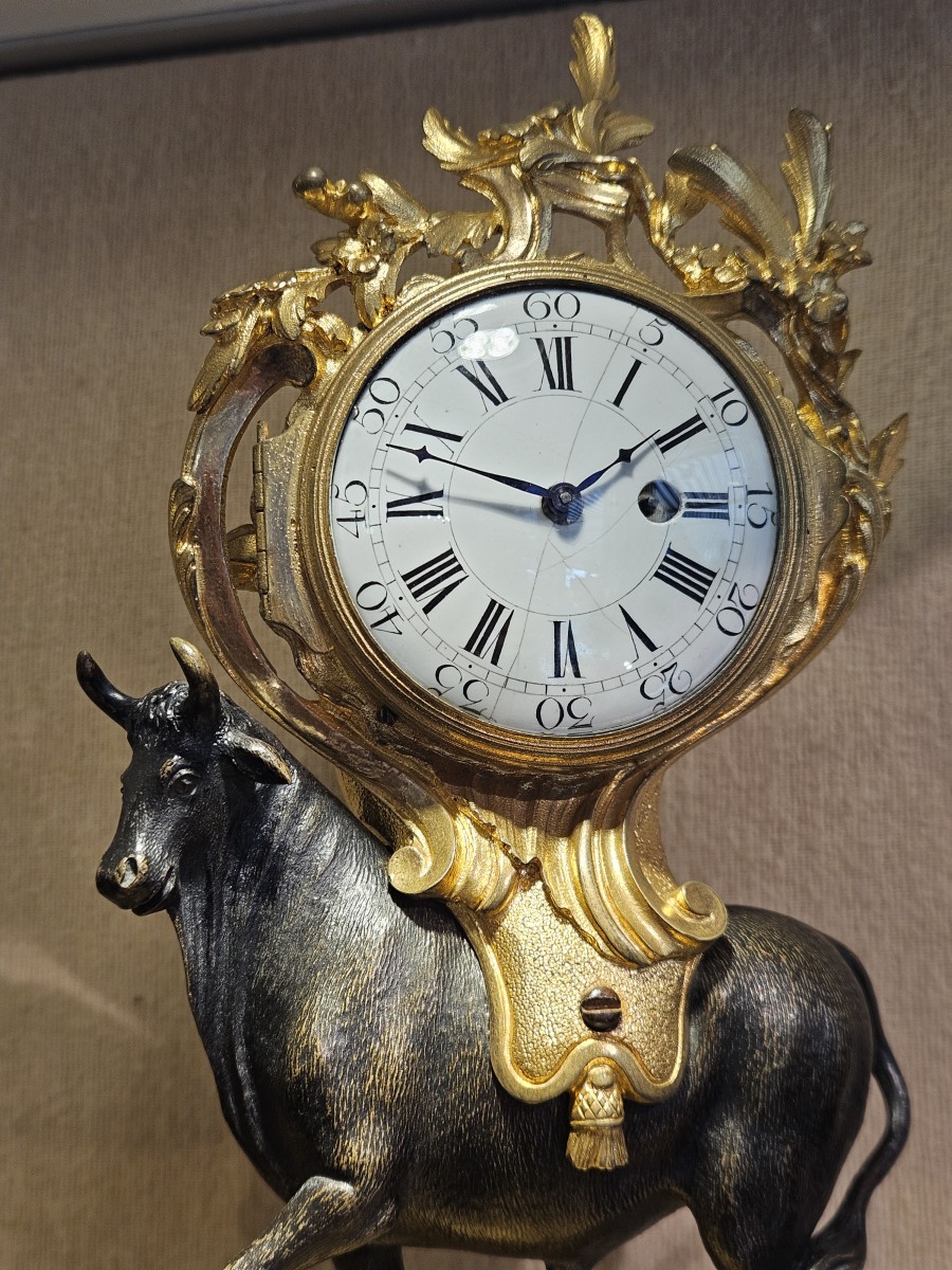 Retrouver le mobilier ou les objets d''art similaires à « Pendule de table au taureau Louis XV » présenté par Hirsch Antiquités, antiquaire à Paris dans la catégorie Pendule Louis XV, Horlogerie.