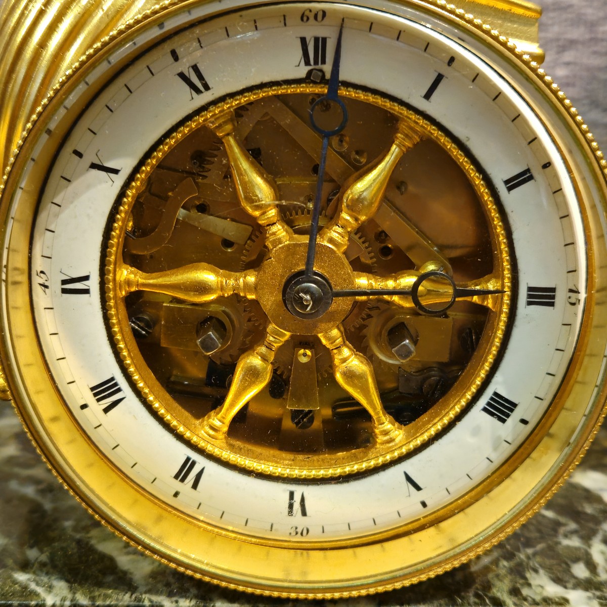Au centre, le cadran à chiffres romains révèle un mécanisme apparent, ajoutant une dimension technique à cette œuvre décorative prestigieuse.