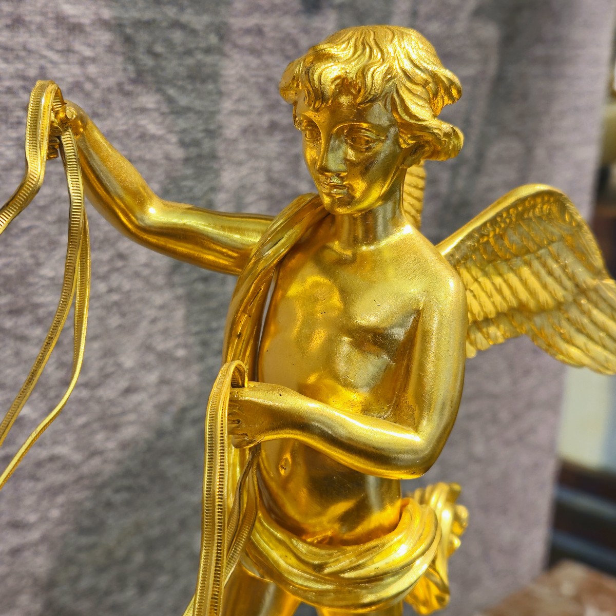 Cupidon, ailes déployées, conduit un char tiré par deux chevaux fougueux, symbole de passion et de victoire amoureuse. La scène mythologique, d’un dynamisme remarquable, met en valeur un travail de ciselure exceptionnel, alliant précision anatomique, drapés élégants et détails raffinés.