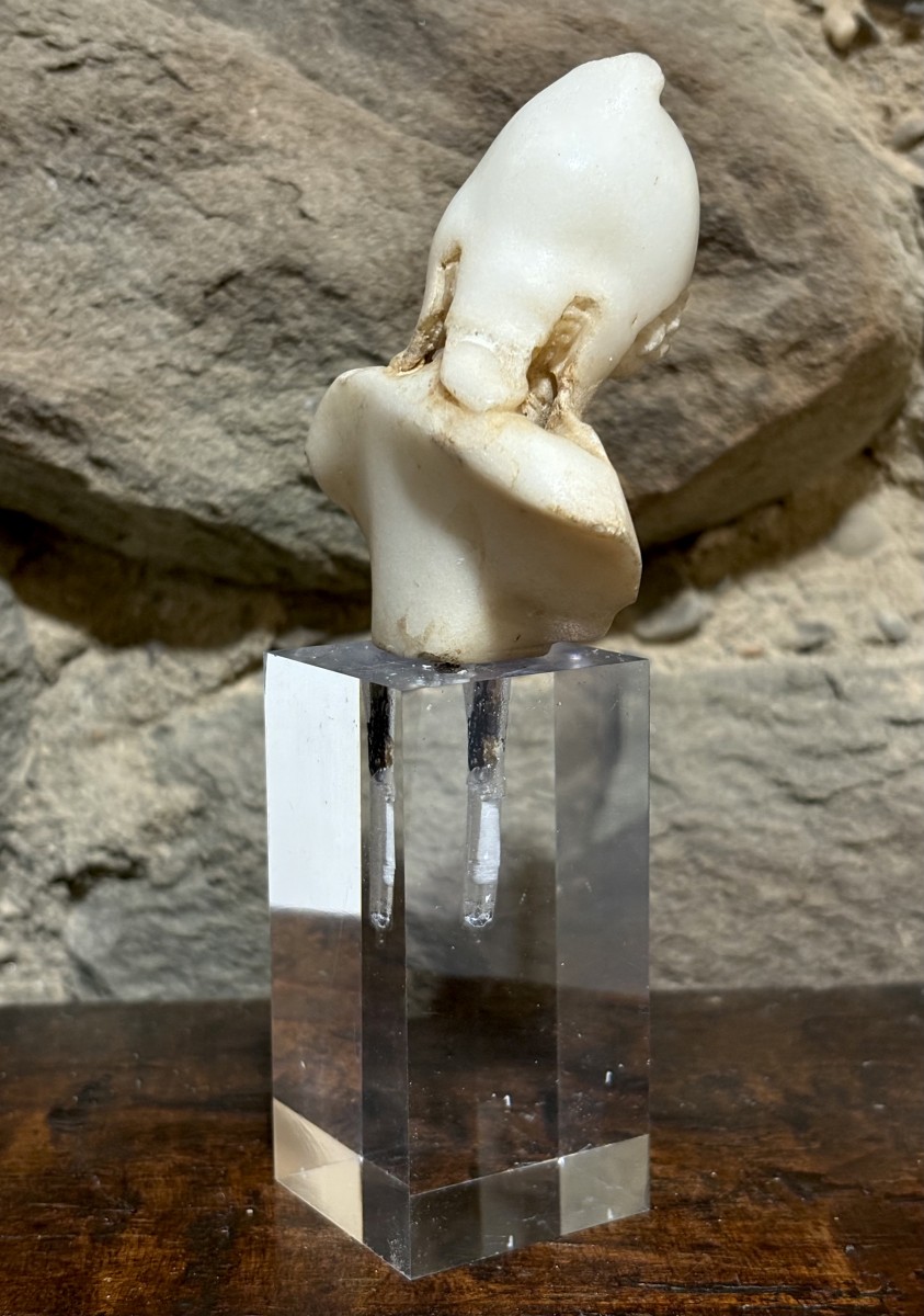 Notre petit buste représente un sujet extrêmement rare : le dieu Attis, une divinité antique dont le culte s’est répandu durant l’époque impériale romaine. Né en Phrygie, fils du démon hermaphrodite Agditis et de Nana, fille du fleuve Sakarya, il fut chassé dans les montagnes par cette dernière, allaité par une chèvre et élevé par des bergers. Attis devint un beau jeune homme dont Cybèle, fille du roi de Phrygie, tomba amoureuse. De nombreuses légendes entourent leur amour tumultueux : Attis mourut, puis Cybèle le ressuscita et l’engagea comme aurige. Les érudits associent le dieu Attis à toutes les divinités liées aux anciens rites d’apaisement de la fertilité de la terre, trouvant un parallèle avec Adonis, qui rivalisait avec lui en beauté. Il est représenté comme un beau jeune homme coiffé d’un bonnet phrygien ; son visage rappelle celui d’Antinoüs, le favori de l’empereur Hadrien.