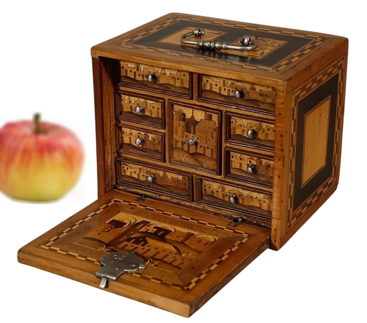 Très petit cabinet architectonique, presque un coffret en cabinet, de table mais aussi très probablement de voyage, en bois massifs en intarsias toutes faces, ouvrant par un abattant dissimulant huit tiroirs (celui du bas simulant deux tiroirs).