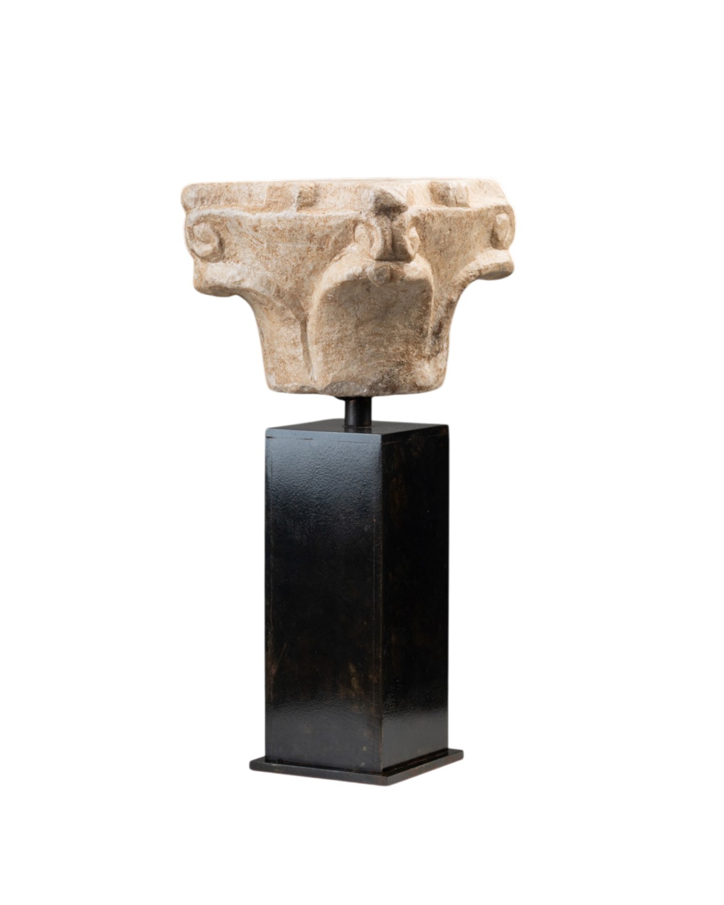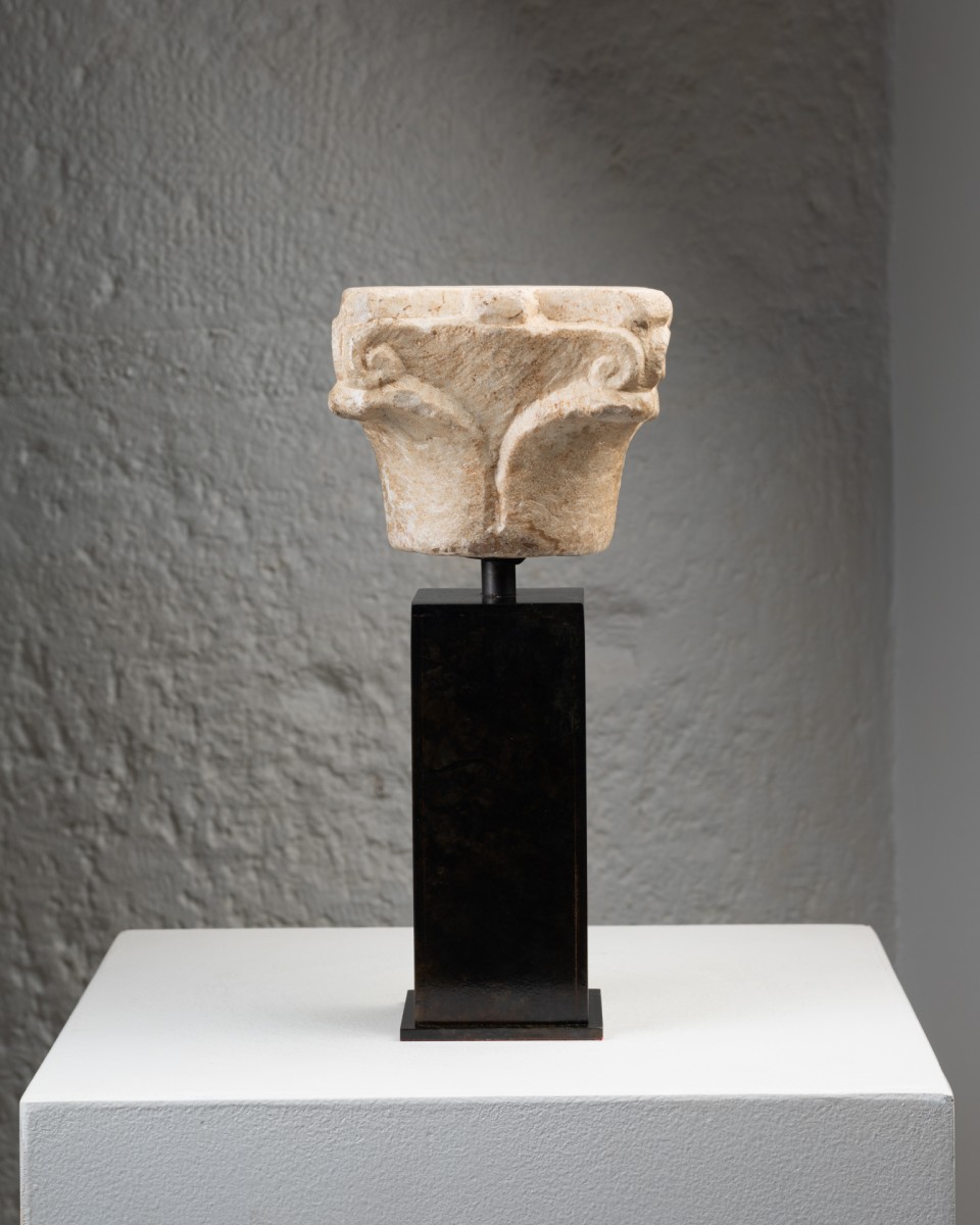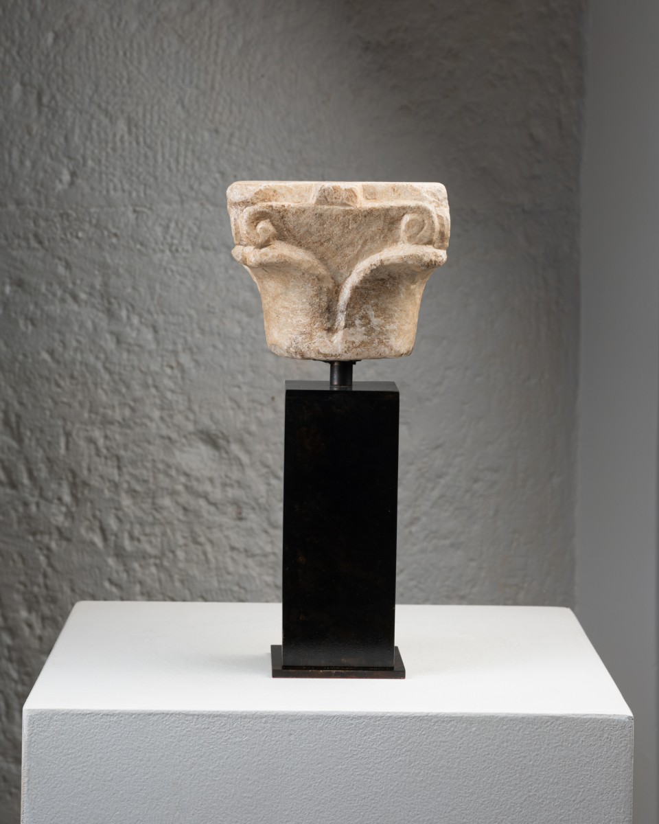 Ce petit chapiteau en marbre blanc, légèrement veiné, d’origine italienne, peut être situé à la charnière entre l’époque romane et le début de l’époque gothique. Sculpté sur toutes ses faces, il présente une corbeille ornée de motifs végétaux stylisés, notamment des feuilles d’eau aux extrémités arrondies, ainsi que des crochets et des formes évoquant des crosses aux angles.