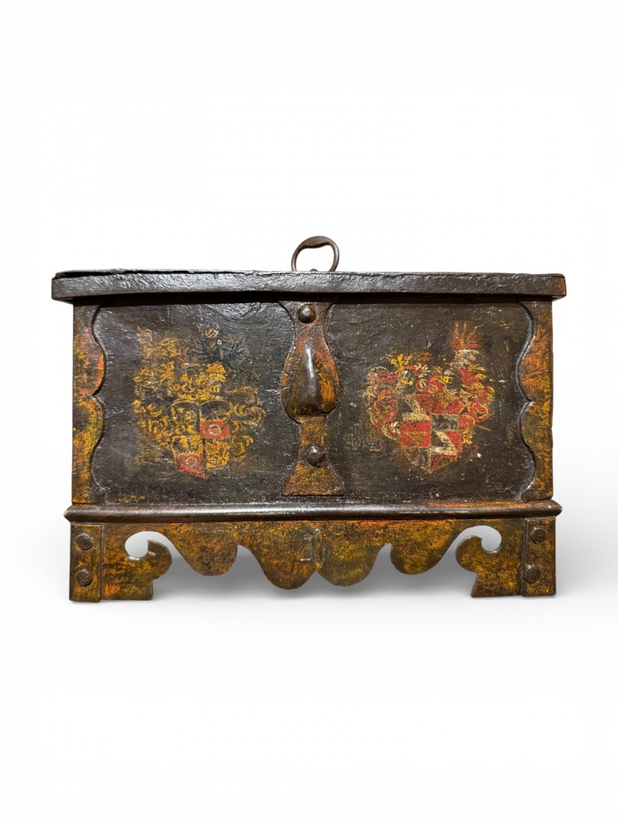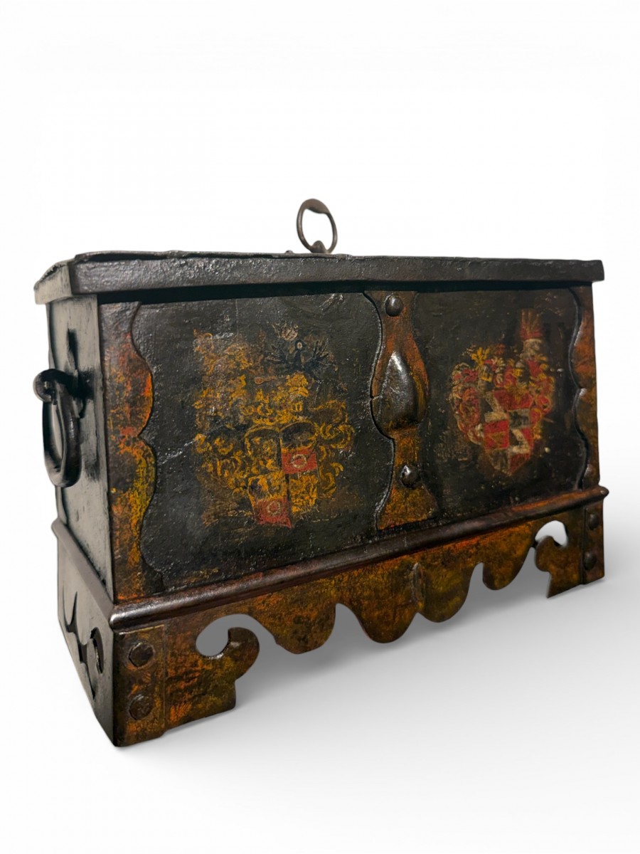 Les panneaux latéraux sont décorés de motifs peints, comprenant notamment des armoiries polychromes sur fond sombre, typiques de la production nurembergeoise de cette période. L’intérieur révèle un mécanisme de serrure complexe, avec plaques et pièces mobiles, caractéristique des coffrets de sûreté allemands du XVIIe siècle.