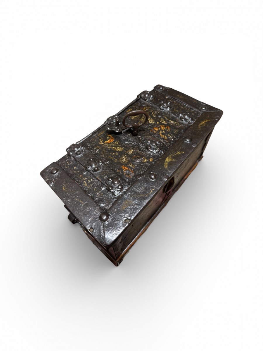 Rare coffret de Nuremberg en fer forgé, datant du début du XVIIe siècle. De forme rectangulaire, il présente une construction robuste en tôle et éléments rivetés, avec un couvercle bombé légèrement incliné, muni d’un anneau de préhension. Les côtés sont ornés de poignées tombantes en anneau, et la base est rehaussée d’un décor ajouré découpé en volutes.