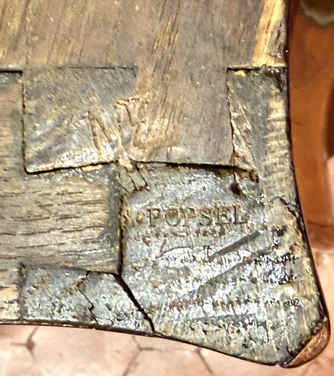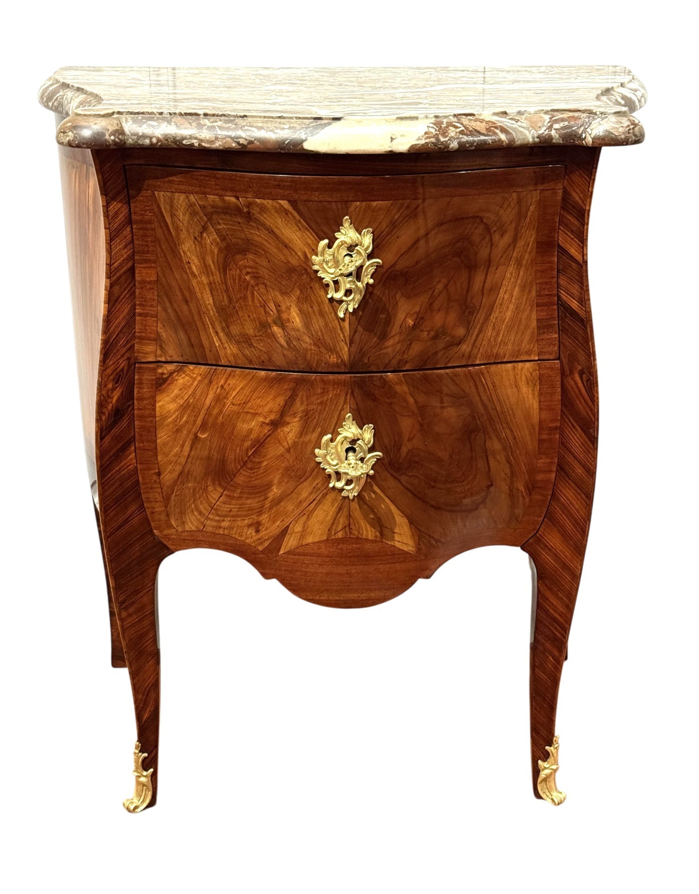 Petite commode d’époque Louis XV estampillée Popsel à façade et côtés galbés à montants pincés, elle ouvre par deux tiroirs de longueur à traverses de soutien dissimulées. L’ensemble est marqueté de bois de rose de fil et de bout (en semelle ou également dénommé en saucisson*) à contrefort de bois de violette, sur un bâti de chêne et résineux à fonçure de chêne. Belle ornementation de bronze ciselé et doré, tels que sabots rocailles, entrées de serrure et clefs parachèvent son décor. Le tout est coiffé d’une feuille de marbre en vieux rance** (également appelé « rouge rance belge ») . L’estampillée Popsel est Frappée sur le montant antérieur droit, une trace de jurande figurant à ses côtés. Jean Popsel, reçu maître le 5 juillet 1755.