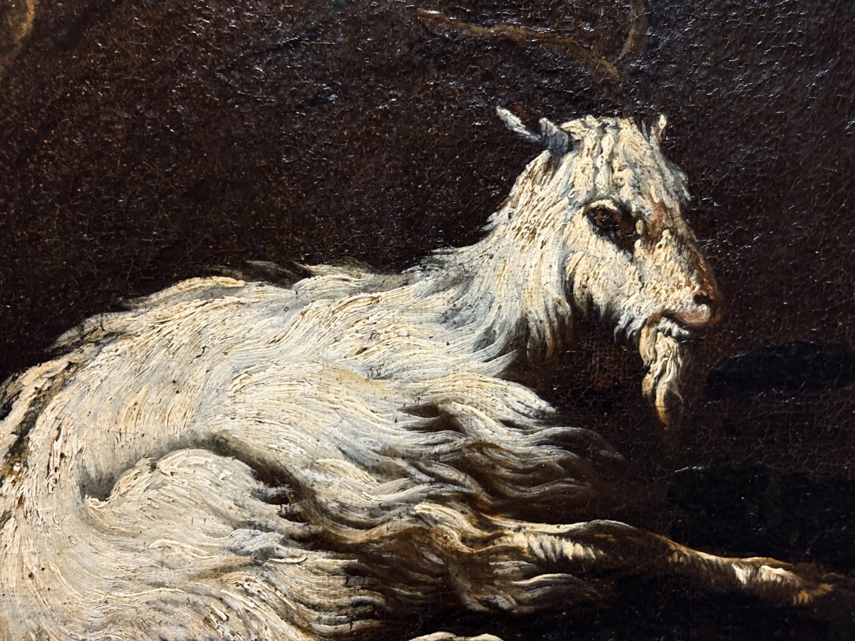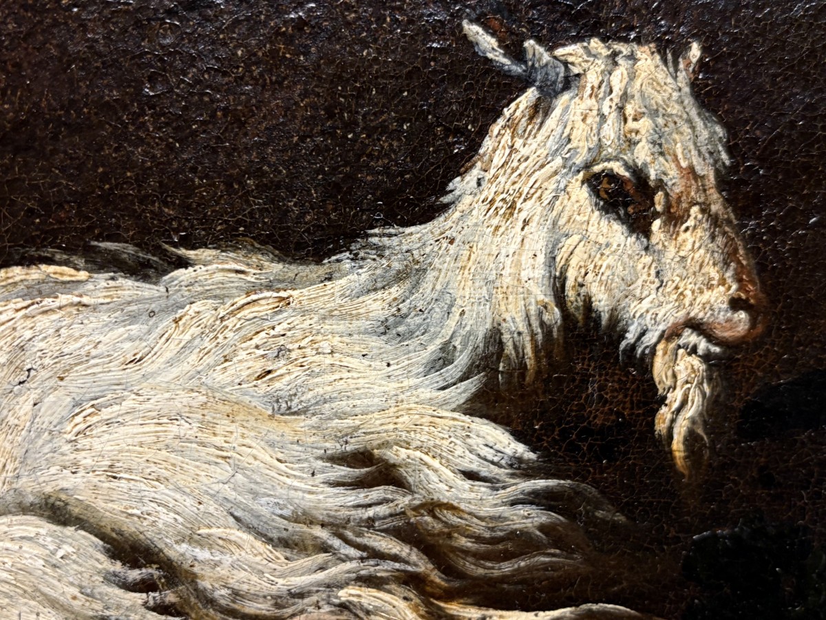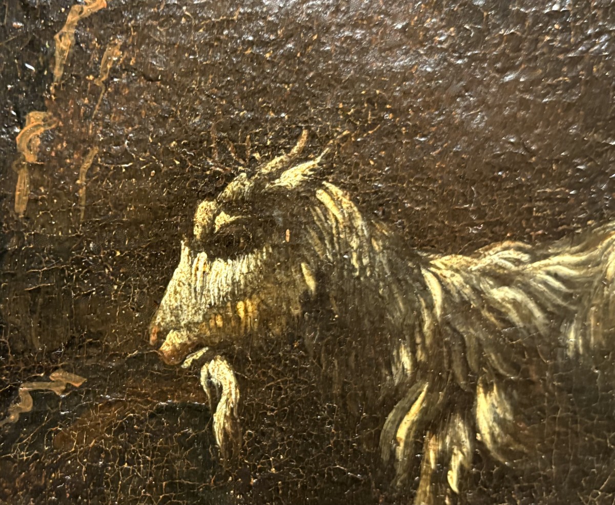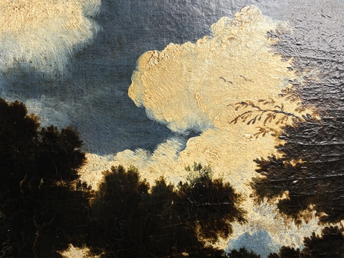 Une magnifique toile de grande taille attribuée à Philipp Roos, plus connu sous le nom de Rosa da Tivoli, a rejoint notre collection. Provenant d'une collection privée romaine, elle nous est parvenue intacte, avec son splendide cadre d'origine appelé Maratta. Afin de lui redonner tout son éclat, elle a été confiée aux mains expertes de notre restauratrice de confiance, qui a réalisé un nettoyage impeccable et minutieux, la toile étant recouverte de près de 400 ans de saleté et de vieux vernis.