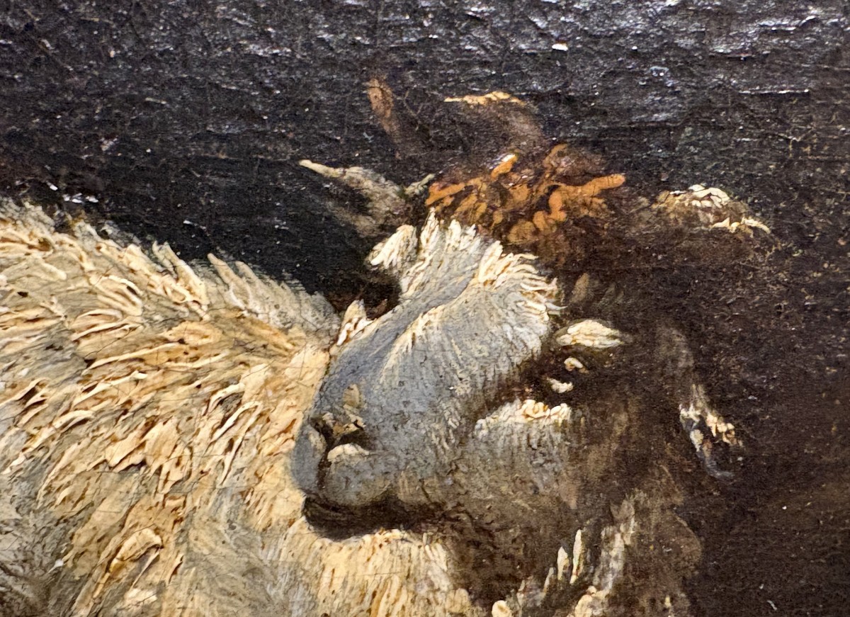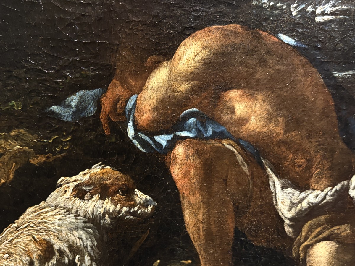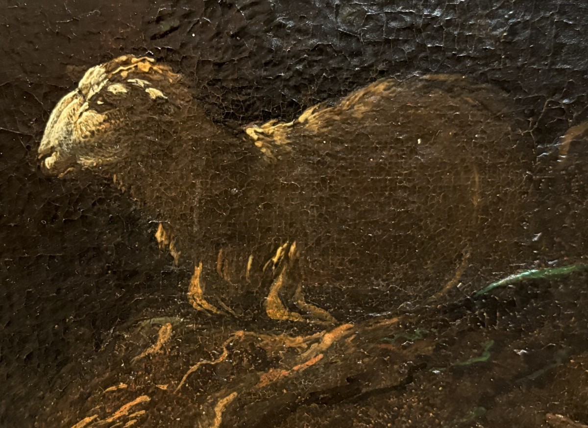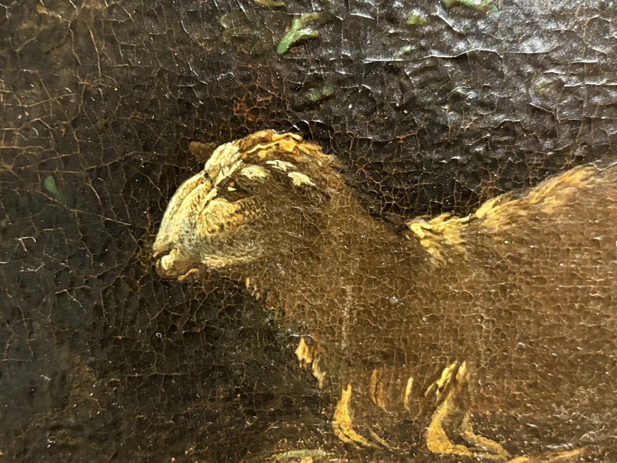 Une magnifique toile de grande taille attribuée à Philipp Roos, plus connu sous le nom de Rosa da Tivoli, a rejoint notre collection. Provenant d'une collection privée romaine, elle nous est parvenue intacte, avec son splendide cadre d'origine appelé Maratta. Afin de lui redonner tout son éclat, elle a été confiée aux mains expertes de notre restauratrice de confiance, qui a réalisé un nettoyage impeccable et minutieux, la toile étant recouverte de près de 400 ans de saleté et de vieux vernis.