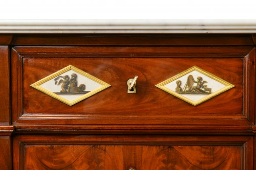 À pans coupés. Au centre un abattant dissimulant des tiroirs. De chaque côté une petite armoire à portes pleine. Dans la ceinture et dans la corniche se placent 6 tiroirs. Pieds gaines. Les centres des panneaux et des tiroirs sont décorés de plaques en marbre peintes en grisaille à l’imitation du bronze le médaillon central représentant une scène antique, représentant le triomphe de Cérès, dessus de marbre blanc mouluré.
