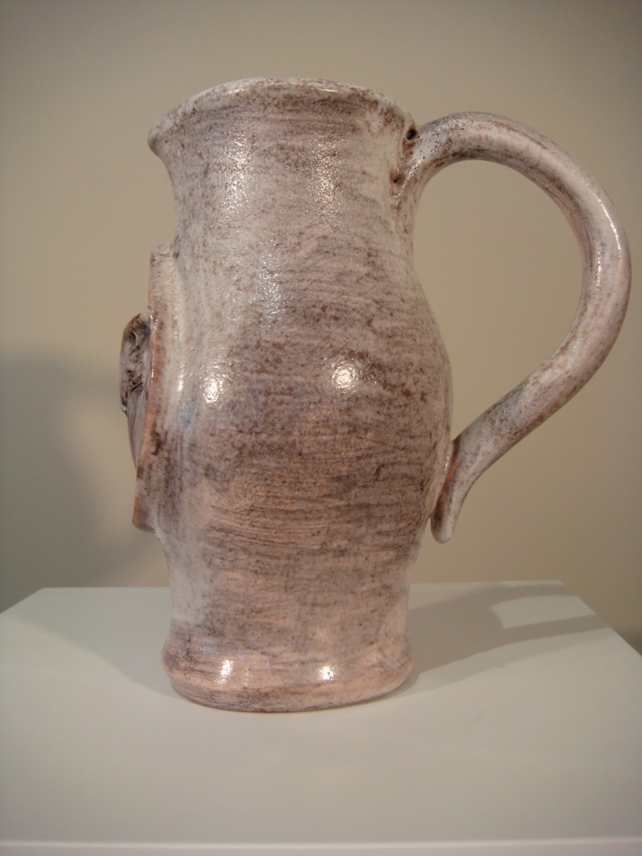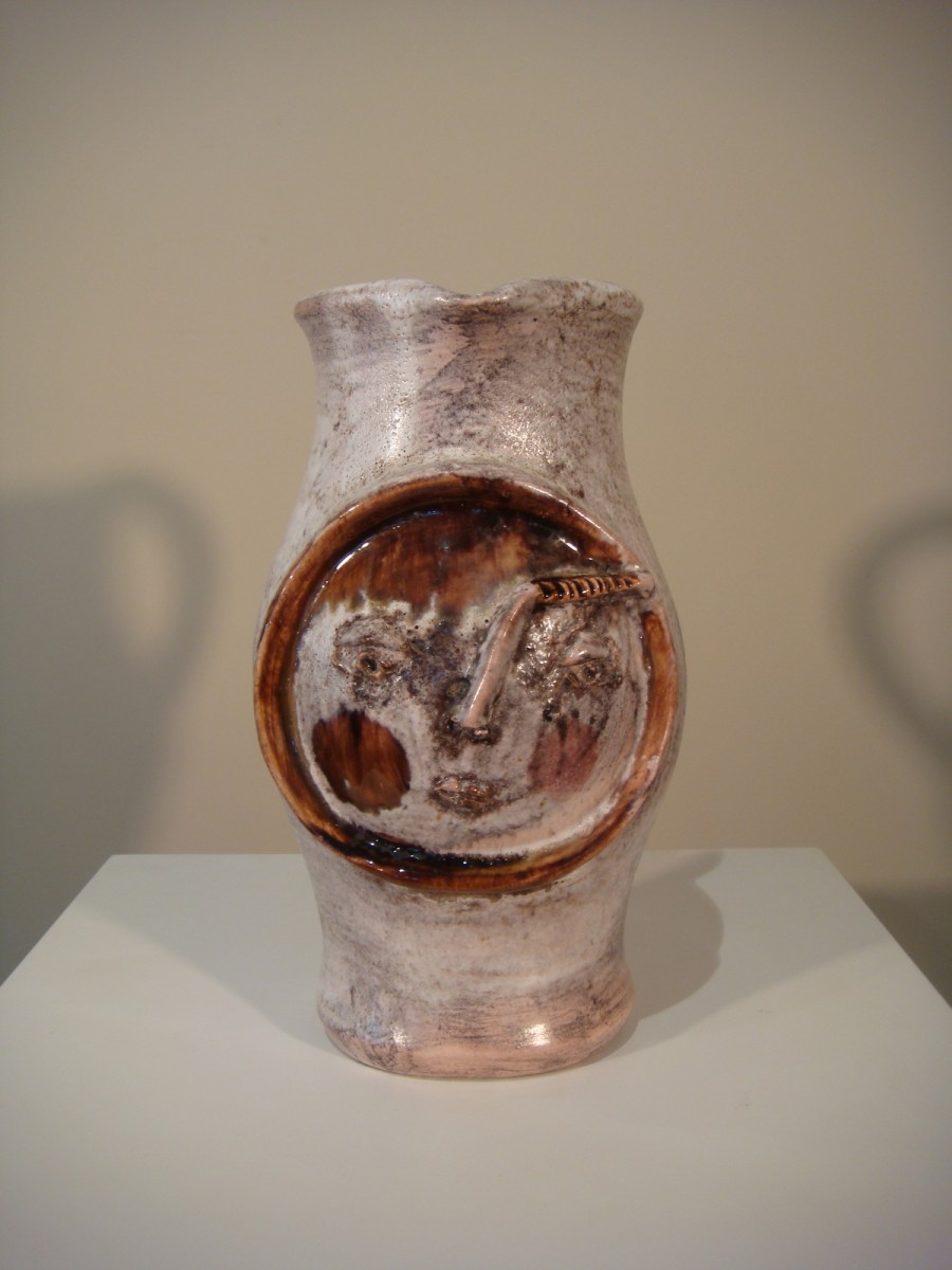 Pichet en céramique à glaçure laiteuse sur fond terre a grande anse avec en son milieu sur la panse un mascaron représentant un visage stylisé de femme à pommettes d’ émail brun clair. Ce pichet porte la signature en dessous de Cloutier R J pour Robert et Jean Cloutier, frères céramistes de la seconde moitié du XX ème Siècle. Présence d’un micro éclat en pourtour du médaillon en dessous.