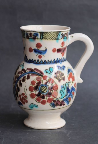 Pichet en céramique siliceuse de Küthaya (Turquie Ottomane), à décor polychrome de fleurs, formant des rosaces, des palmes et des galons à treillage sur le col.