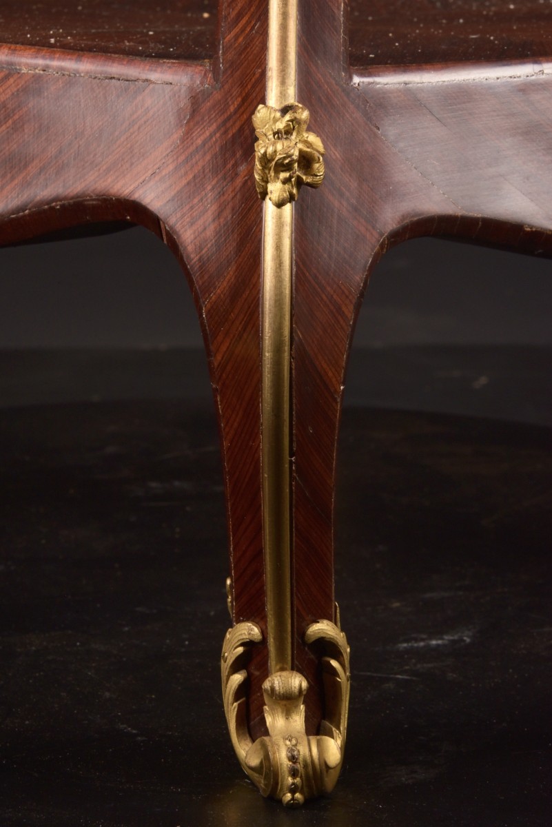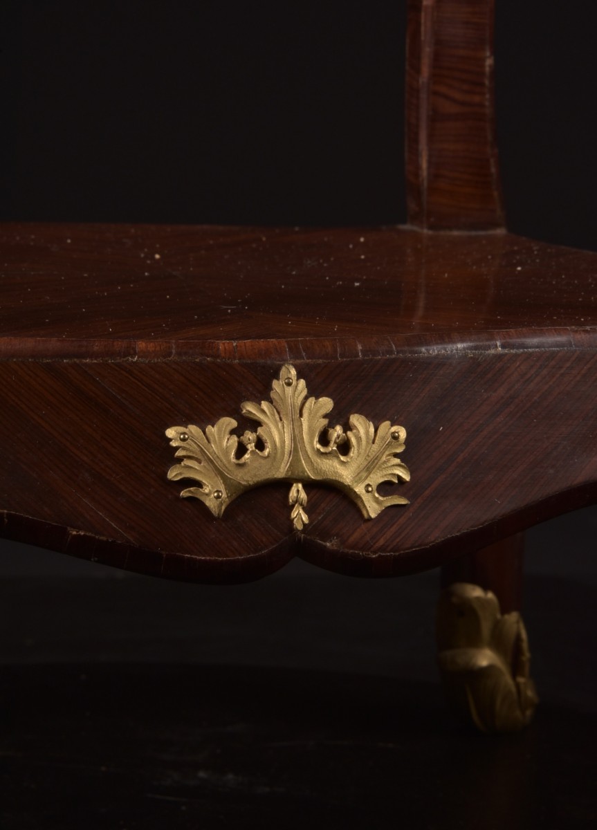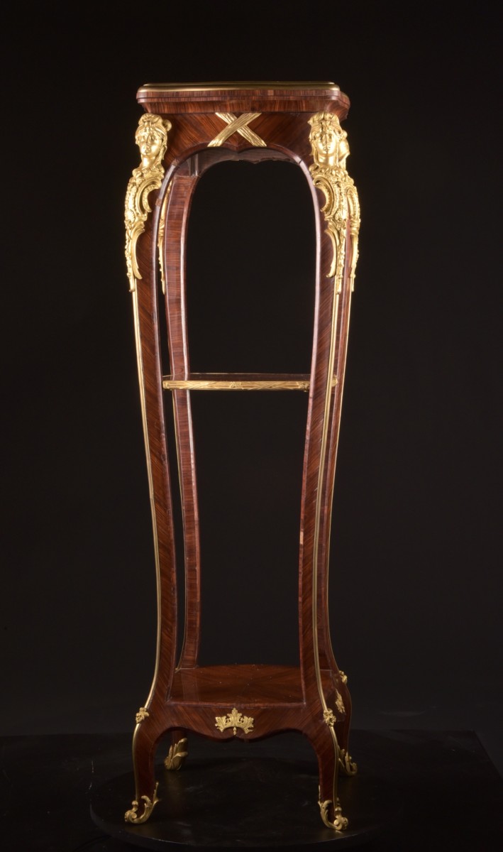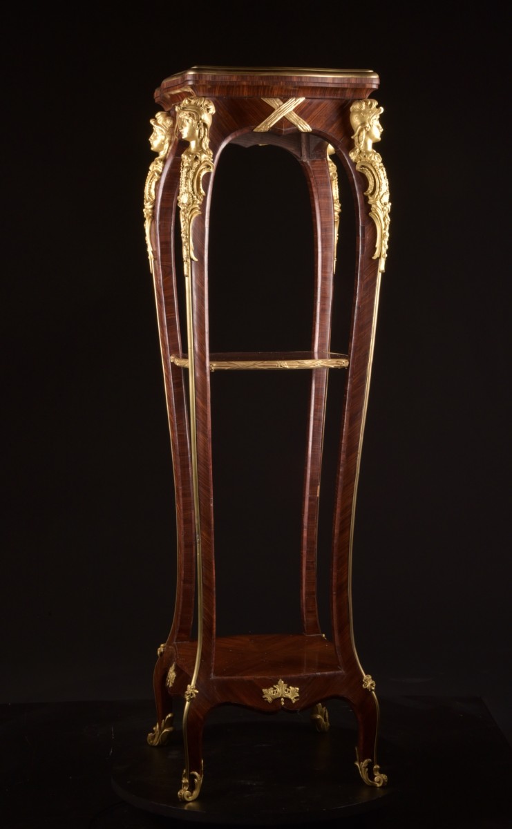 Élégant piédestal en acajou richement veiné, agrémenté de montures en bronze finement ciselé et doré. La structure élancée repose sur des montants galbés ornés de têtes féminines d’inspiration antique, caractéristiques du vocabulaire Empire. L’ensemble est rythmé par des croisillons décoratifs et un plateau intermédiaire, apportant à la fois équilibre visuel et stabilité. Le contraste entre la profondeur chaude de l’acajou et l’éclat du bronze doré souligne la qualité d’exécution et le raffinement décoratif. Les détails finement travaillés témoignent d’un savoir-faire maîtrisé. Travail français de la période Napoléon III, dans le goût du Premier Empire. Dimensions