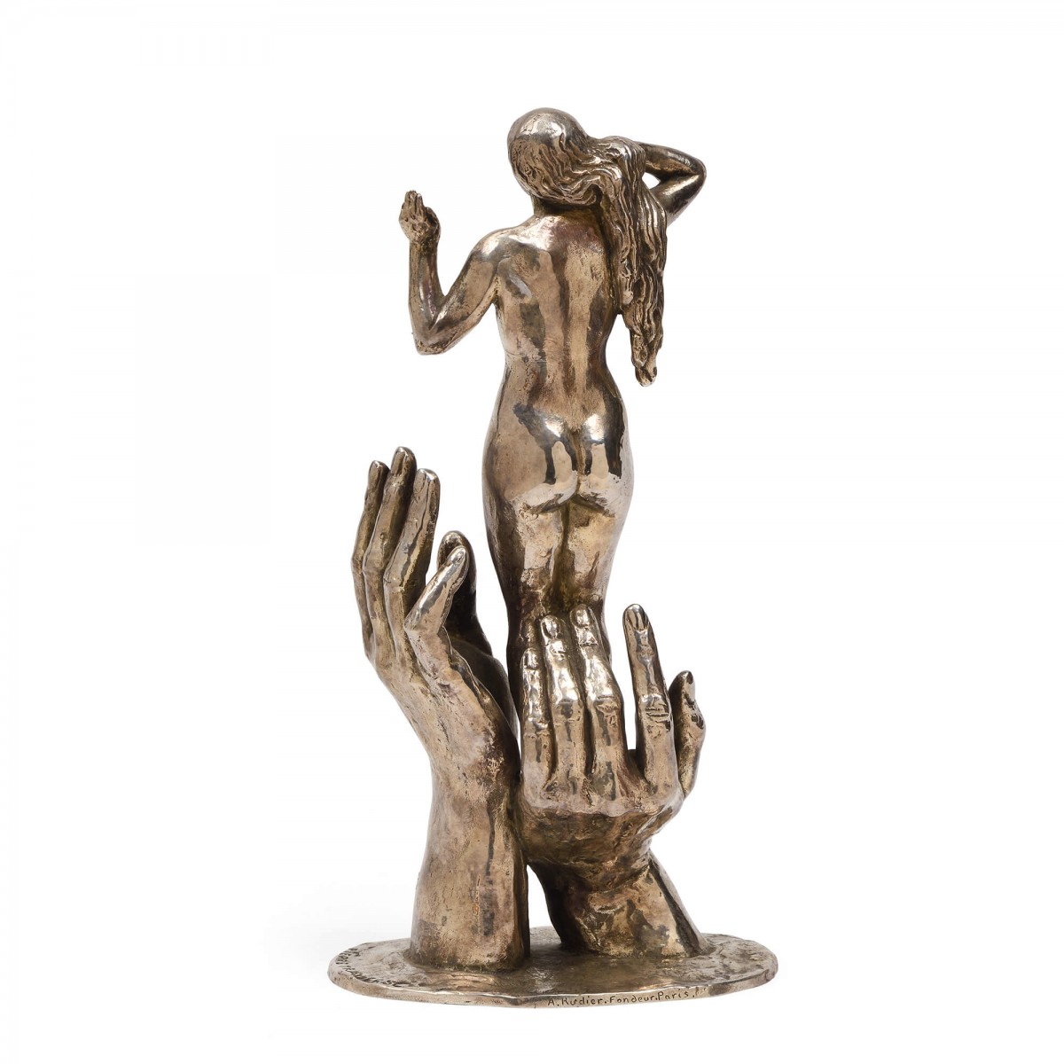 Exceptionnelle sculpture en bronze à patine argentée figurant une jeune femme nue, debout, émergeant avec grâce de deux mains monumentales qui semblent la présenter au monde ou l’offrir en sacrifice symbolique. La figure féminine, aux lignes pures caractéristiques de l’esthétique Art Déco, adopte une pose hiératique : une main portée à sa chevelure tandis que l’autre esquisse un geste d’élévation.