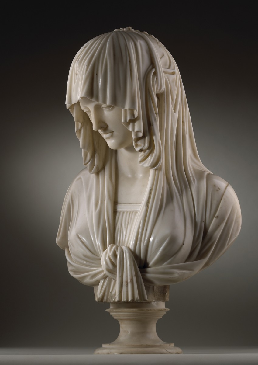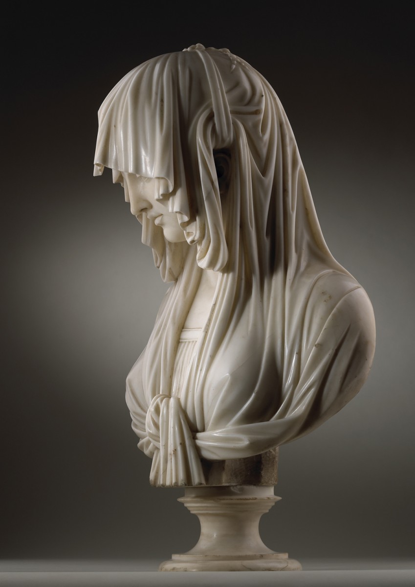 ... excessive. Dans ces œuvres, la figure féminine voilée constitue un motif fréquent, symbolisant le deuil, la piété ou le mystère divin. Le traitement délicat des draperies, notamment du voile translucide, met en valeur la virtuosité du sculpteur dans le rendu de textures complexes en marbre, tout en conférant au sujet une qualité sereine, presque éthérée.