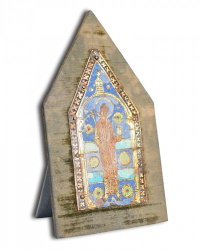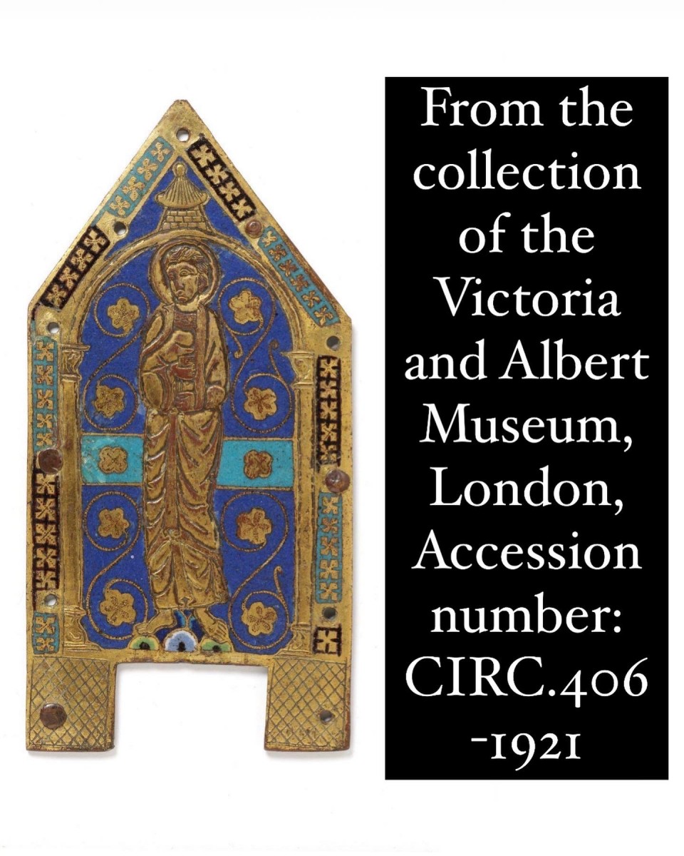 La forme de cette plaque indique qu'elle formait à l'origine l'extrémité d'un cercueil reliquaire ou "chasse" assemblé à Limoges, France, pour abriter des reliques, la figure masculine représente un apôtre.
