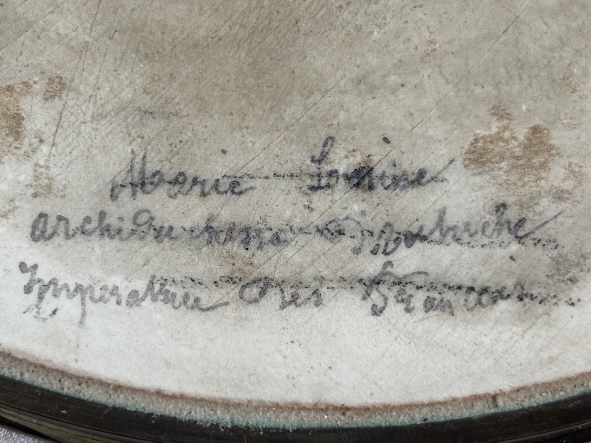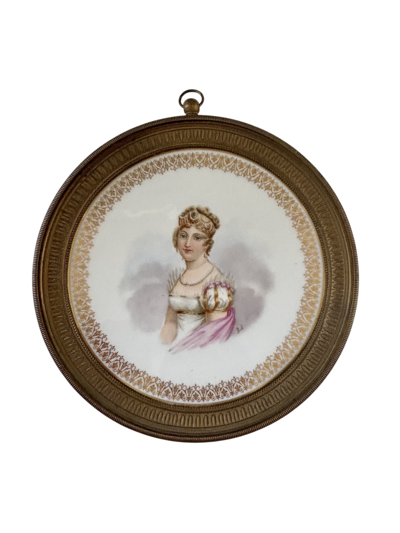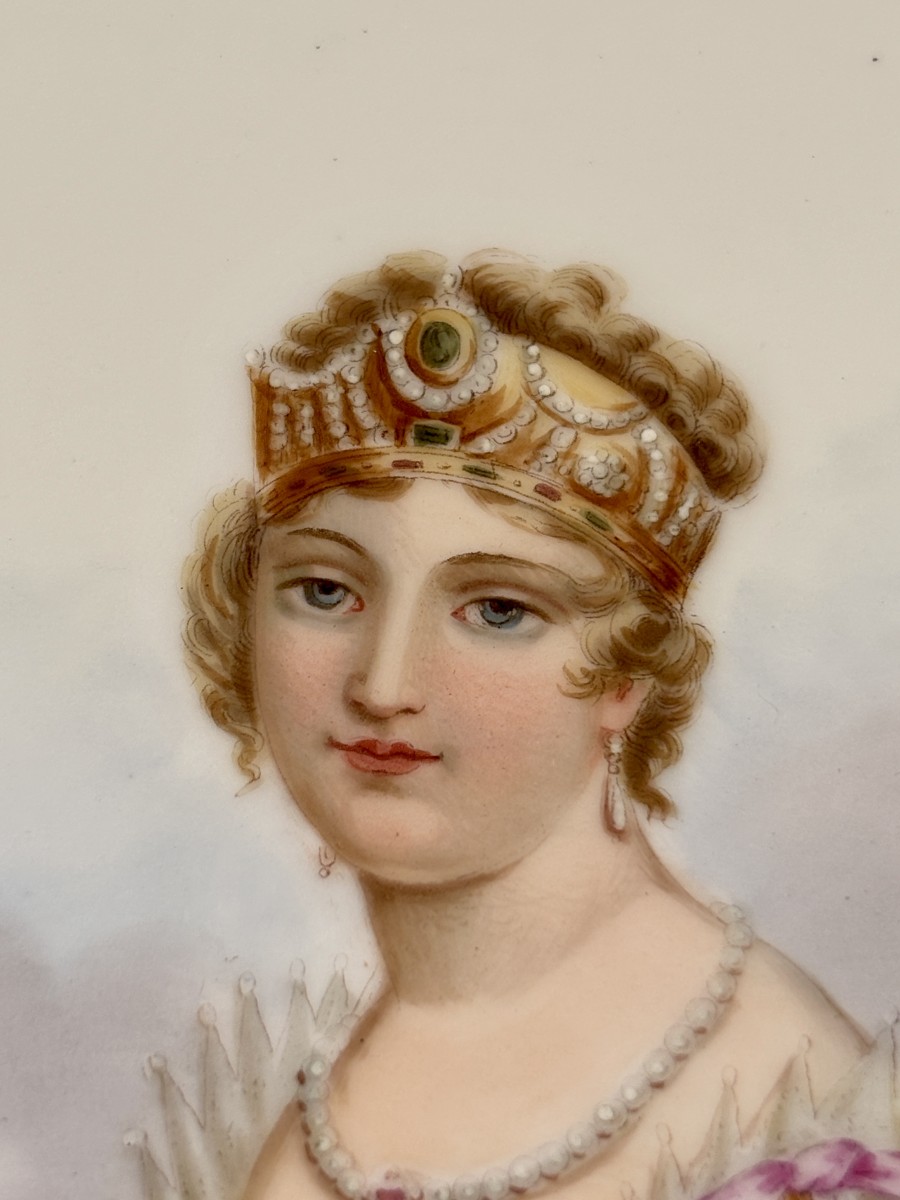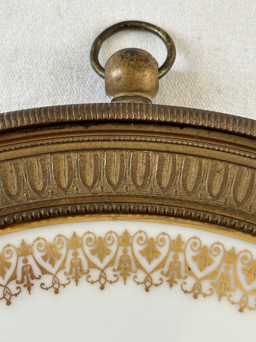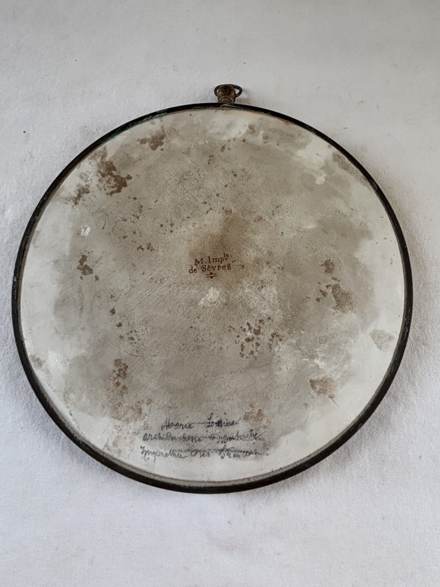 Grande plaque ronde en porcelaine impériale de Sèvres à décor en polychromie du buste de Marie Louise d'Autriche avec un cerclage de bronze.