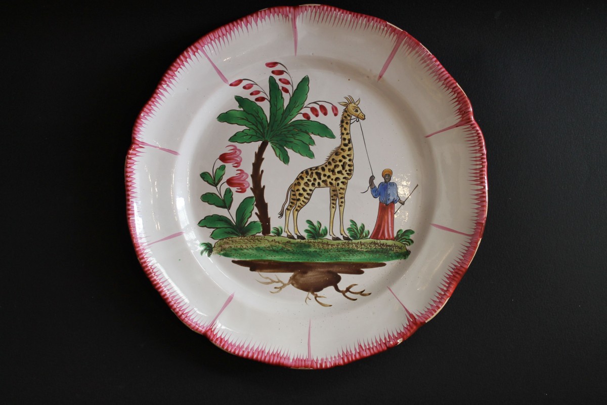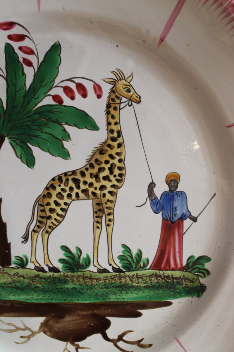 Plat en faïence des Islettes à décor de petit feu à la girafe avec son gardien noir au turban, palmier sur la gauche, terrasse de verdure.