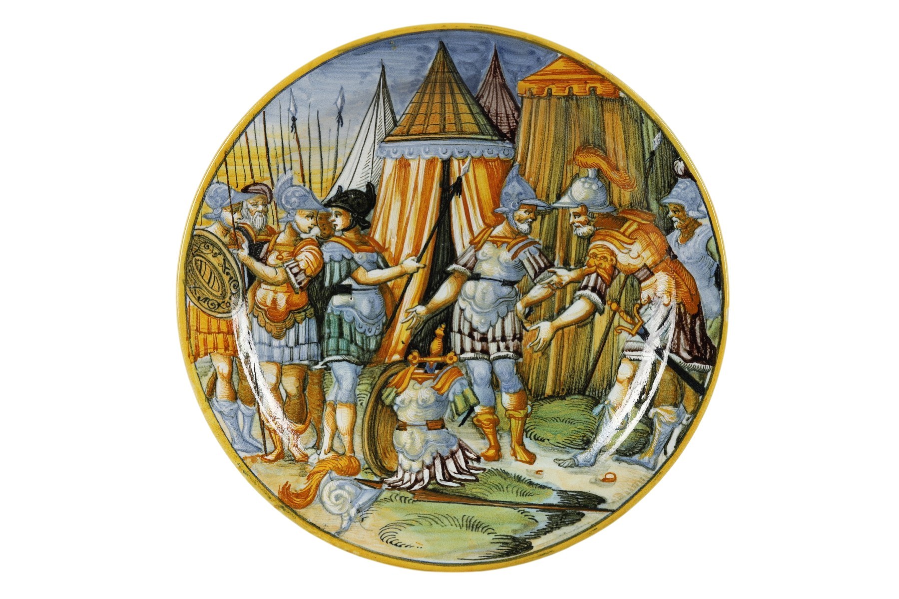 Plat circulaire en faïence à décor polychrome en plein représentant une scène mythologique d'Ulysse et Ajax dans un campement avec des hommes en armes devant une armure avec lance et casque panaché au sol.