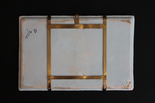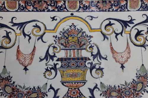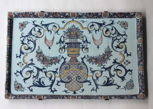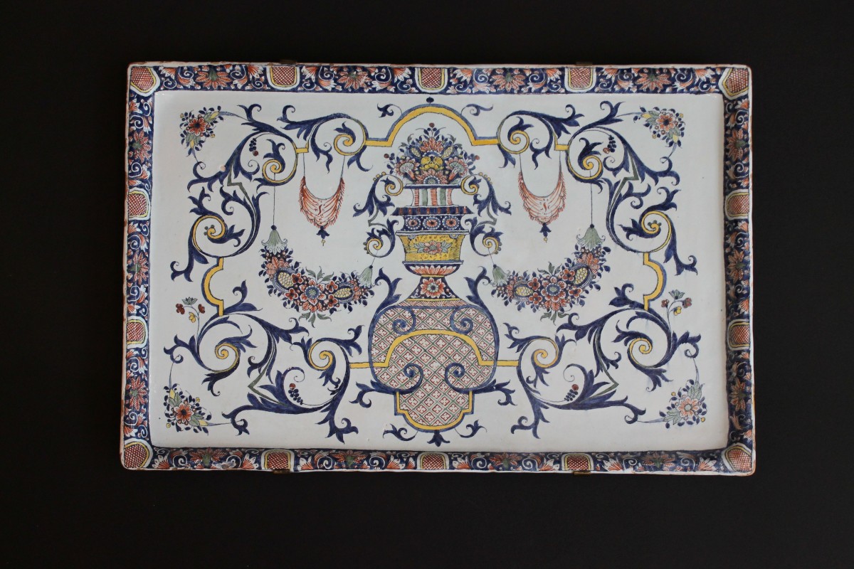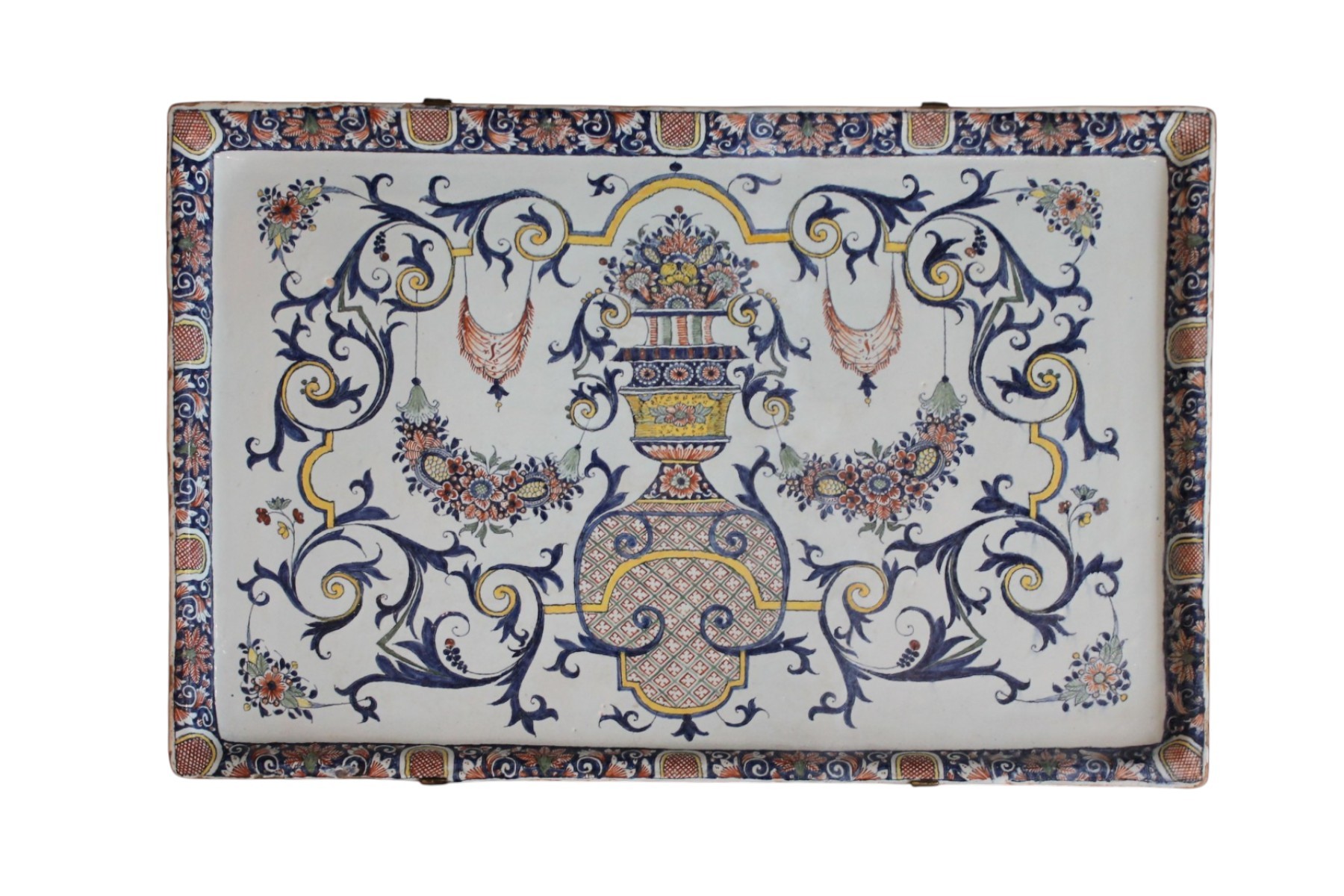 Grand plateau rectangulaire de table en faïence de Rouen à décor polychrome d'un vase fleuri, drapés, guirlandes de fleurs et ferronnerie. Bordure de fleurs et rinceaux sur fond bleu alternés de quadrillages en réserve.