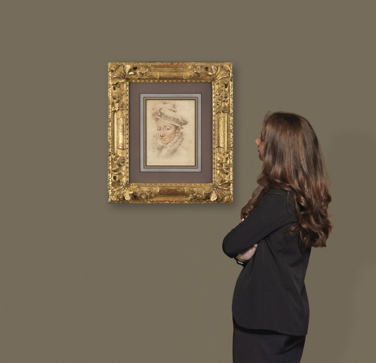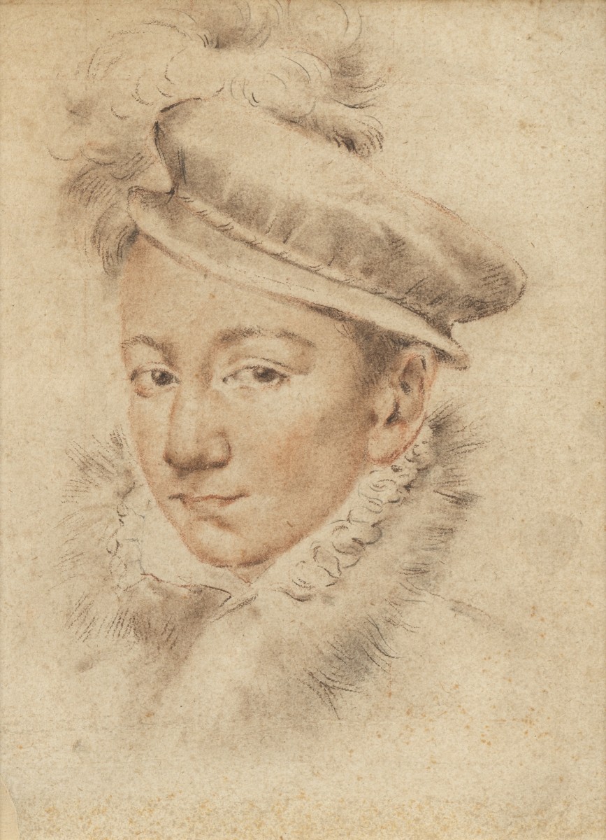 Notre délicat portrait s’inscrit pleinement dans la tradition graphique de l’atelier de François Clouet, tout en révélant une main distincte. C’est au crayon noir que le visage se dessine avec un modelé subtil, la sanguine venant réchauffer les carnations. Cette représentation raffinée de Charles IX présente la précision caractéristiques des effigies royales diffusées dans les années 1560–1570. Le jeune roi y apparaît avec sa fraise tuyautée et son chapeau à plumes, selon un type iconographique bien établi à l’époque.