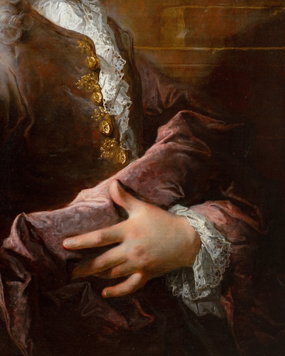 Sur le plan stylistique, l’œuvre se situe à la croisée de la solennité du portrait officiel et d’une approche plus souple et plus intime. La posture assurée, le regard direct et la richesse vestimentaire affirment le rang social du modèle, tandis que la fluidité de la touche et la subtilité des coloris adoucissent toute rigidité excessive. Tant par l’usage virtuose de la couleur que par l’attention portée aux détails, Robert Le Vrac Tournières livre ici une image exemplaire de l’aristocratie française sous la Régence, où l’art du portrait devient un vecteur privilégié d’élégance, de pouvoir et de distinction sociale.