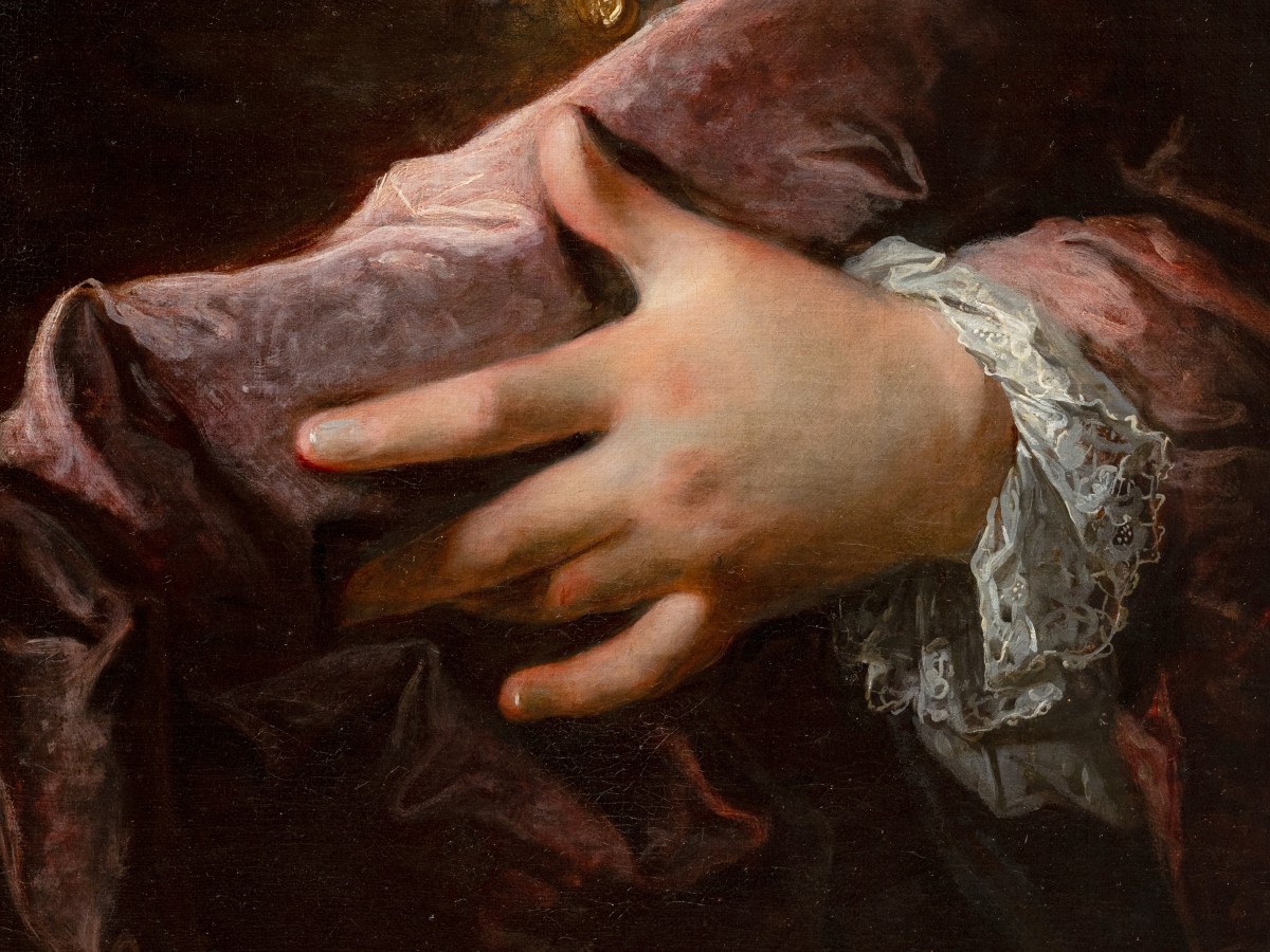 La main qui retient le manteau, fait l’objet d’un soin particulier. Les doigts souples et longs, à l’auriculaire légèrement écarté témoignent d’un idéal de distinction et de raffinement aristocratique. Les ongles, lisses et délicatement brillants, signalent une pureté et participent à la codification sociale du portrait. Le geste très maniéré introduit une tension discrète et contrôlée, relevant d’un vocabulaire gestuel codifié propre au portrait d’apparat.