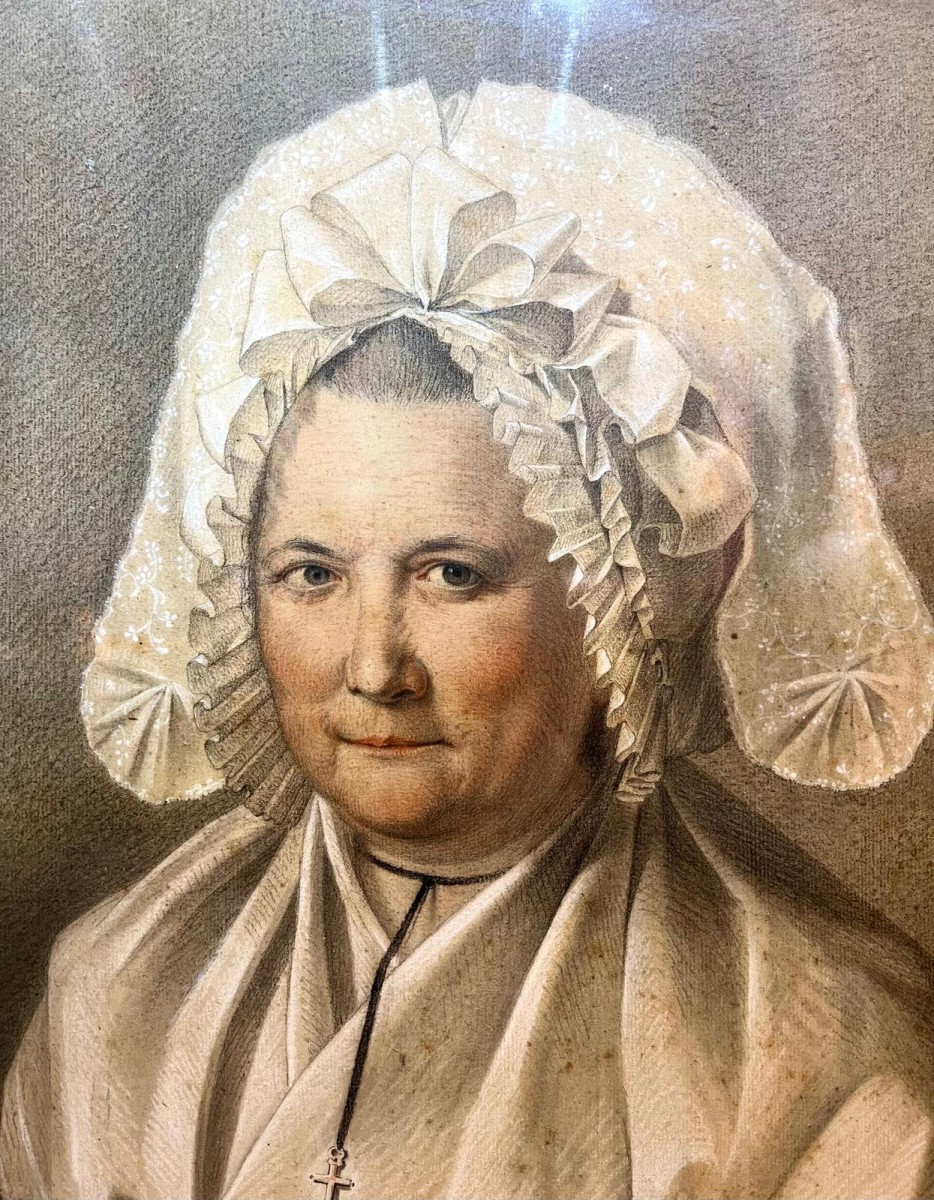 Portait de femme au bonnet, de la fin du XVIIIe siècle, daté An 8 de la Révolution : (23 septembre 1799 au 22 septembre 1800) et signé D.Saint.