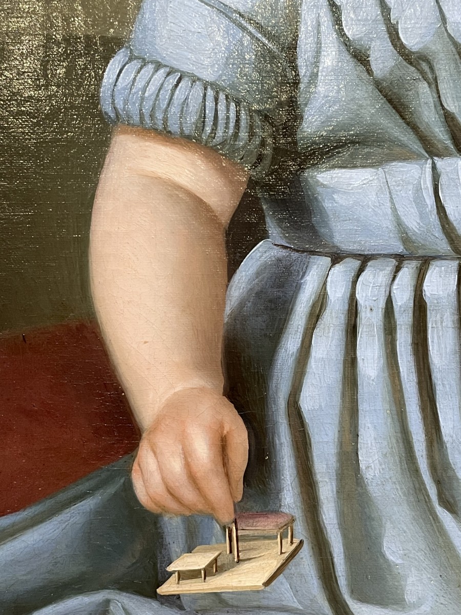 Rare et important portrait d’enfant de la première moitié du XIXe siècle, situable entre le Nord de l’Italie et la sphère autrichienne, dans le plein climat romantique. La jeune fillette est représentée assise, accompagnée d’un petit chien, tandis qu’au premier plan apparaît une remarquable maquette de maison alpine.