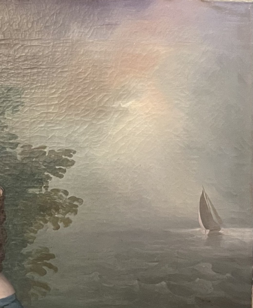 À l’arrière-plan s’ouvre un paysage lacustre animé par une eau légèrement agitée et un voilier solitaire. Ce détail appartient pleinement à la sensibilité romantique, où la nature accompagne les états d’âme et suggère une discrète tonalité mélancolique.