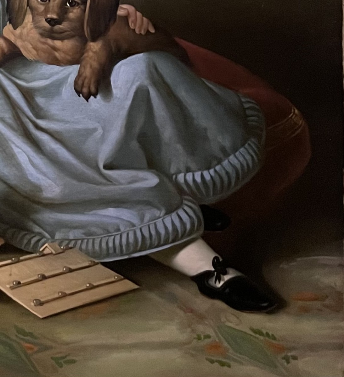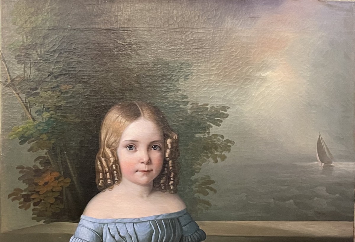 La robe bleu clair, à large encolure, manches courtes bouffantes et taille marquée, correspond à la mode élégante des années 1830. Les longues boucles encadrant le visage ainsi que les petites chaussures noires ornées de nœuds traduisent le soin accordé à l’enfance dans les milieux aisés du temps.