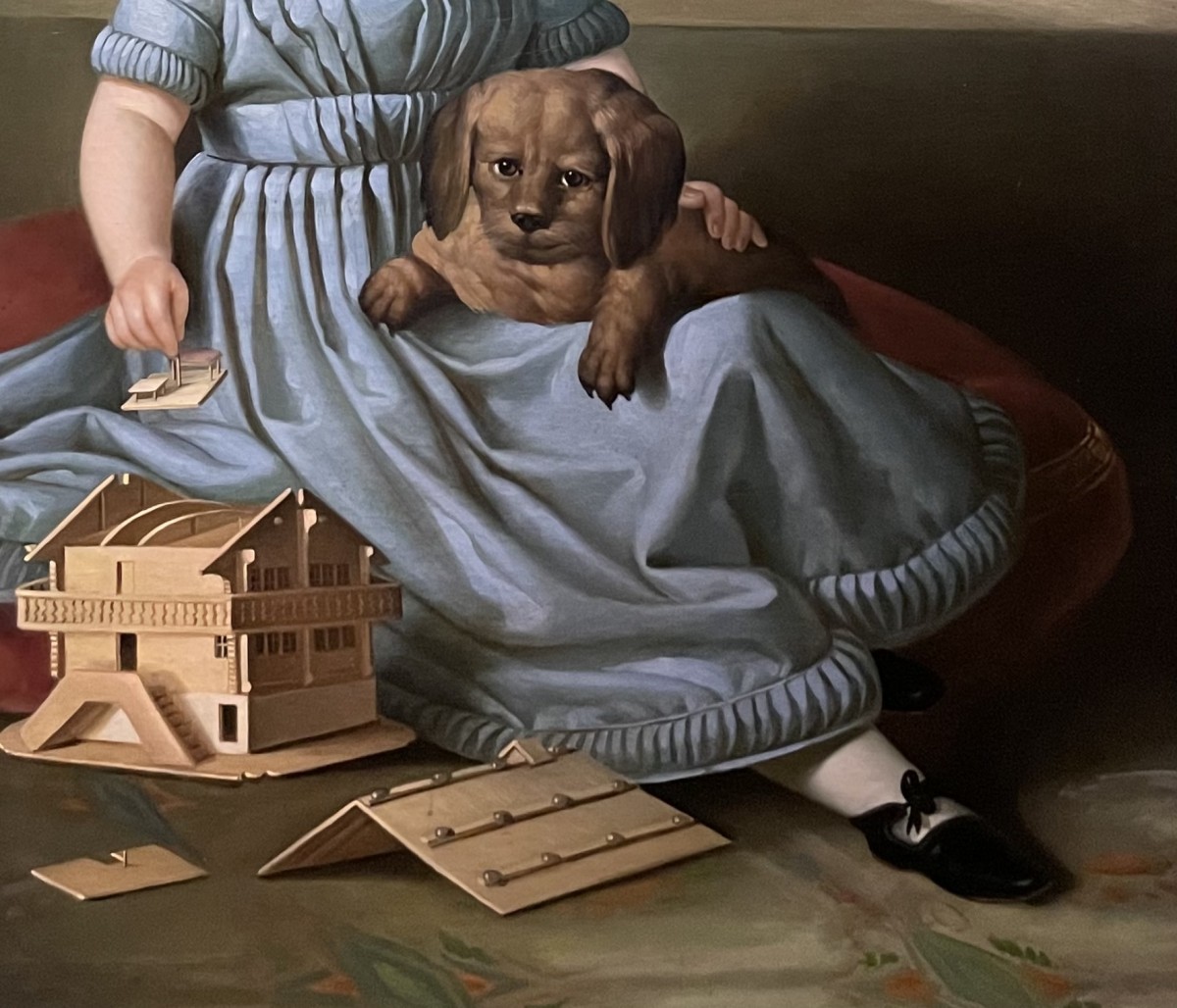 Portrait de fillette au chien et maquette de maison tyrolienne, Nord Italie ou Autriche, vers 1835