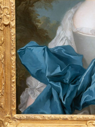... réduite, où les nuances de bleus s’accordent aux blancs argenté et nacrés formant une palette glaciale. Ce chromatisme distinctif de Nattier le distingue de ses portraitistes confrères.