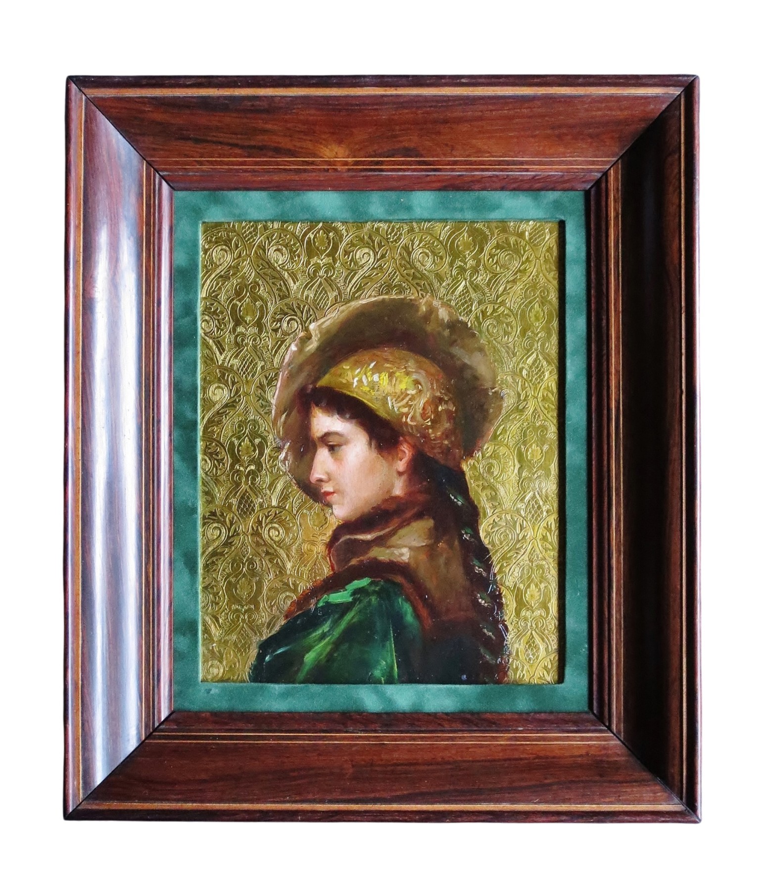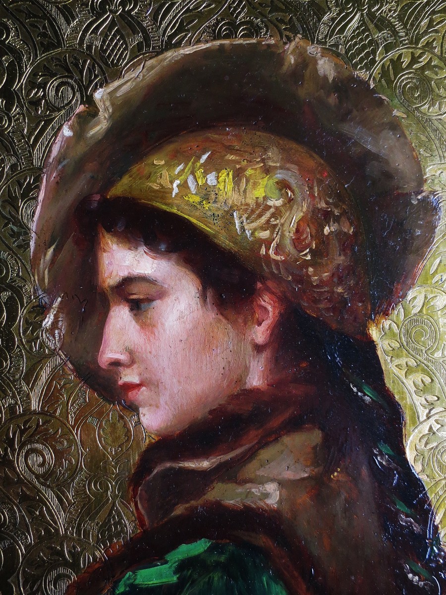 Cette ravissante jeune femme évoque la peinture russe. De la deuxième moitié du XIXe siècle, cette œuvre est peinte sur un support inhabituel, il s'agit d' un panneau de laiton dont la surface, cernant le portrait, est gravée de motifs de volutes et d'arabesques, ce fond en laiton doré évoque les rizas qui embellissent parfois les icônes. Ce procédé très original présente un intérêt esthétique incontestable , il met en valeur en le faisant ressortir ce profil de jeune élégante. Ce portrait de grande qualité nous a fait penser à certaines œuvres d' Ilya Repine peintre russe appartenant au mouvement dit des « ambulants »