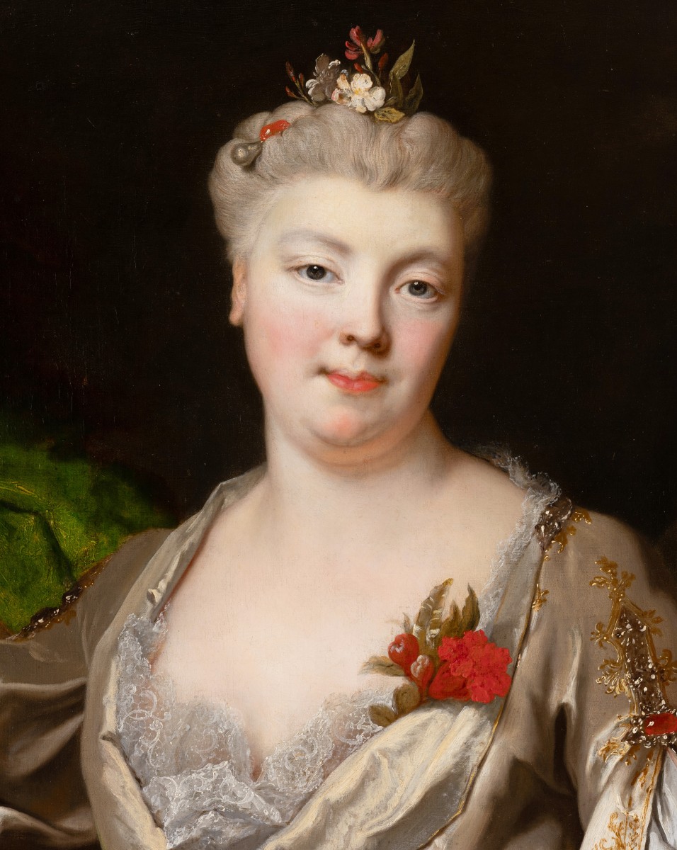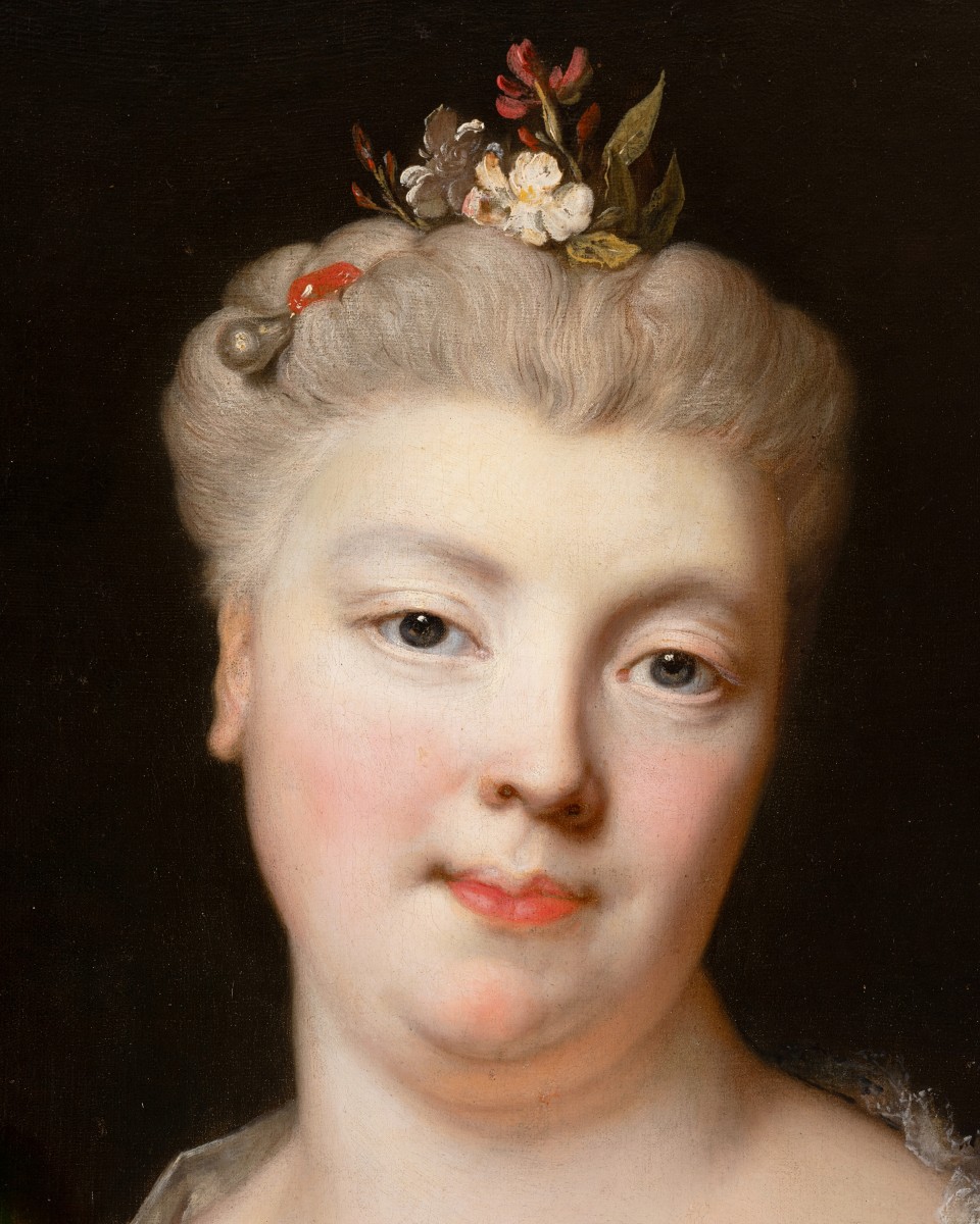 Les cheveux poudrés, relevés en chignon peu volumineux, elle arbore une coiffure plus sobre et naturelle qui remplace les hautes fontanges de la fin du XVIIème siècle. Quelques fleurs sont piquées au sommet de sa tête, et une grosse perle attachée à un rubis rouge étincelle de mille éclats faisant pendant avec les bijoux qui ornent ses manches entaillées.