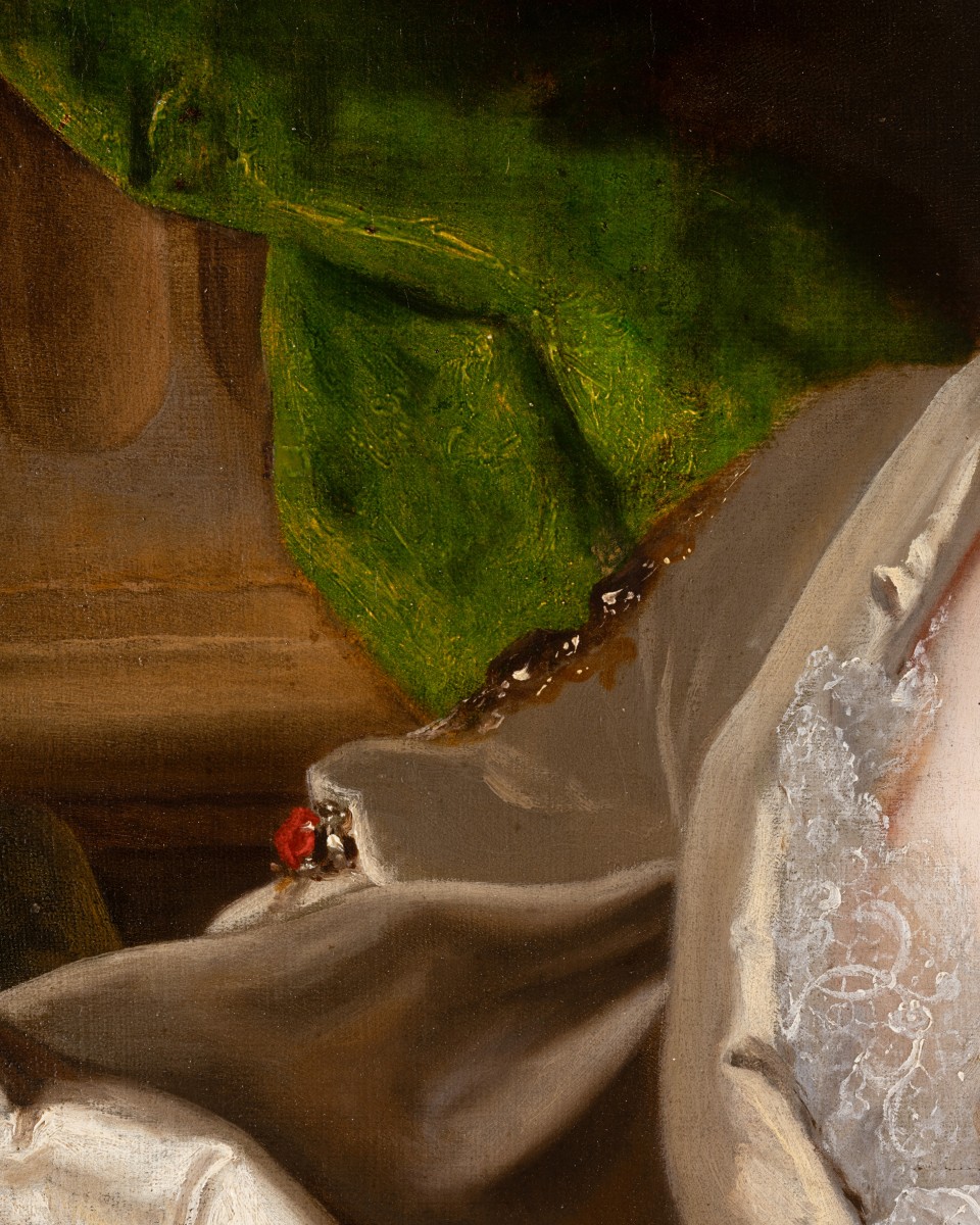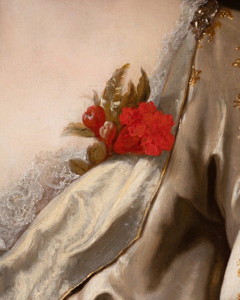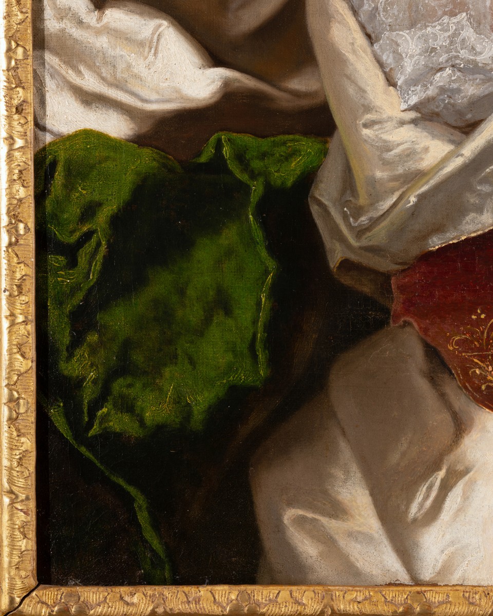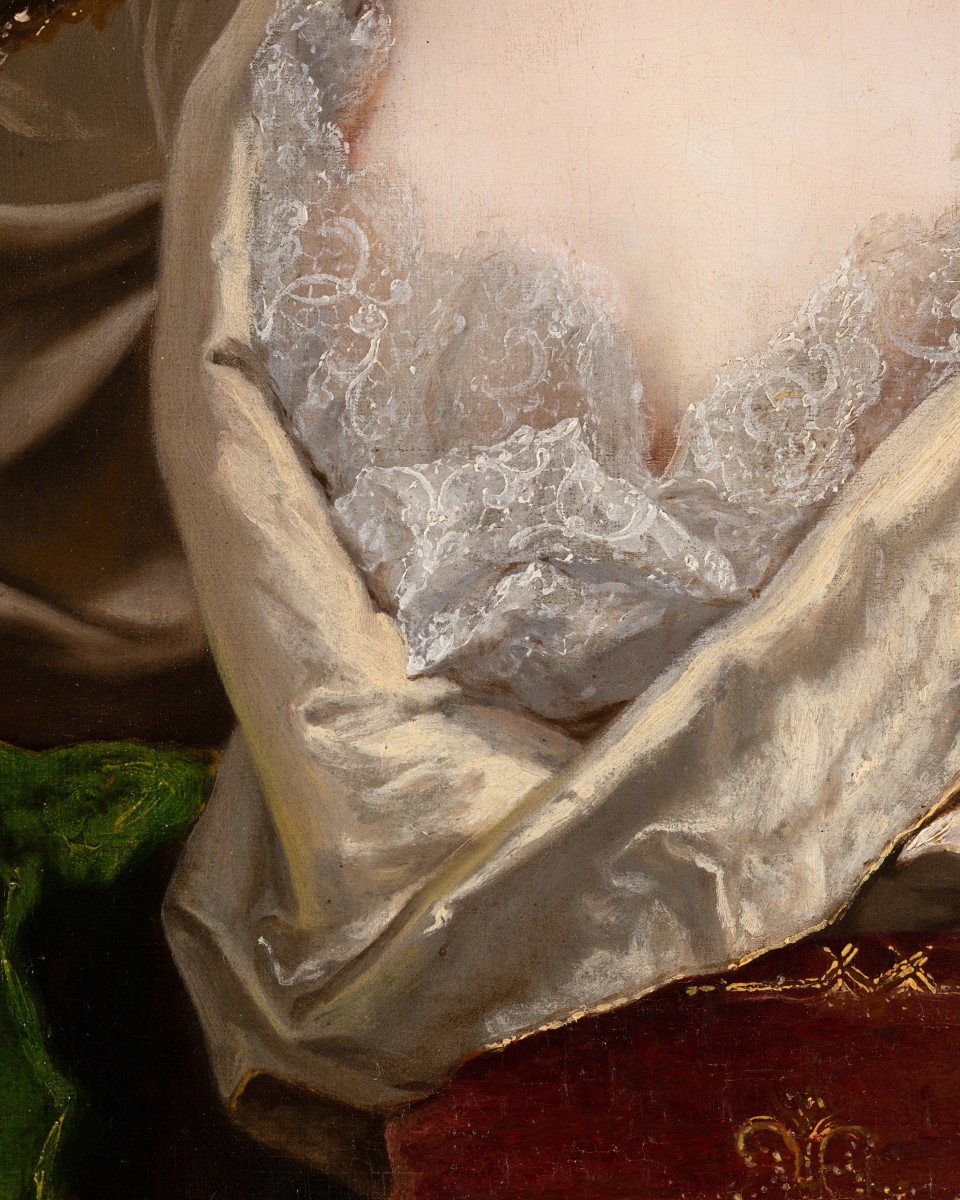 Avec son aisance habituelle Nicolas de Largillierre compose les volumes des étoffes en jouant avec des textures: l’éclat métallique du satin est magnifié par les plis cassants et raides, tandis que le scintillement doré enflamme des crêtes du velours vert. Son pinceau énergique et confiant, sa parfaite connaissance des interactions de chaque matière avec lumière permettent d’obtenir un rendu époustouflant plus vrai que nature.