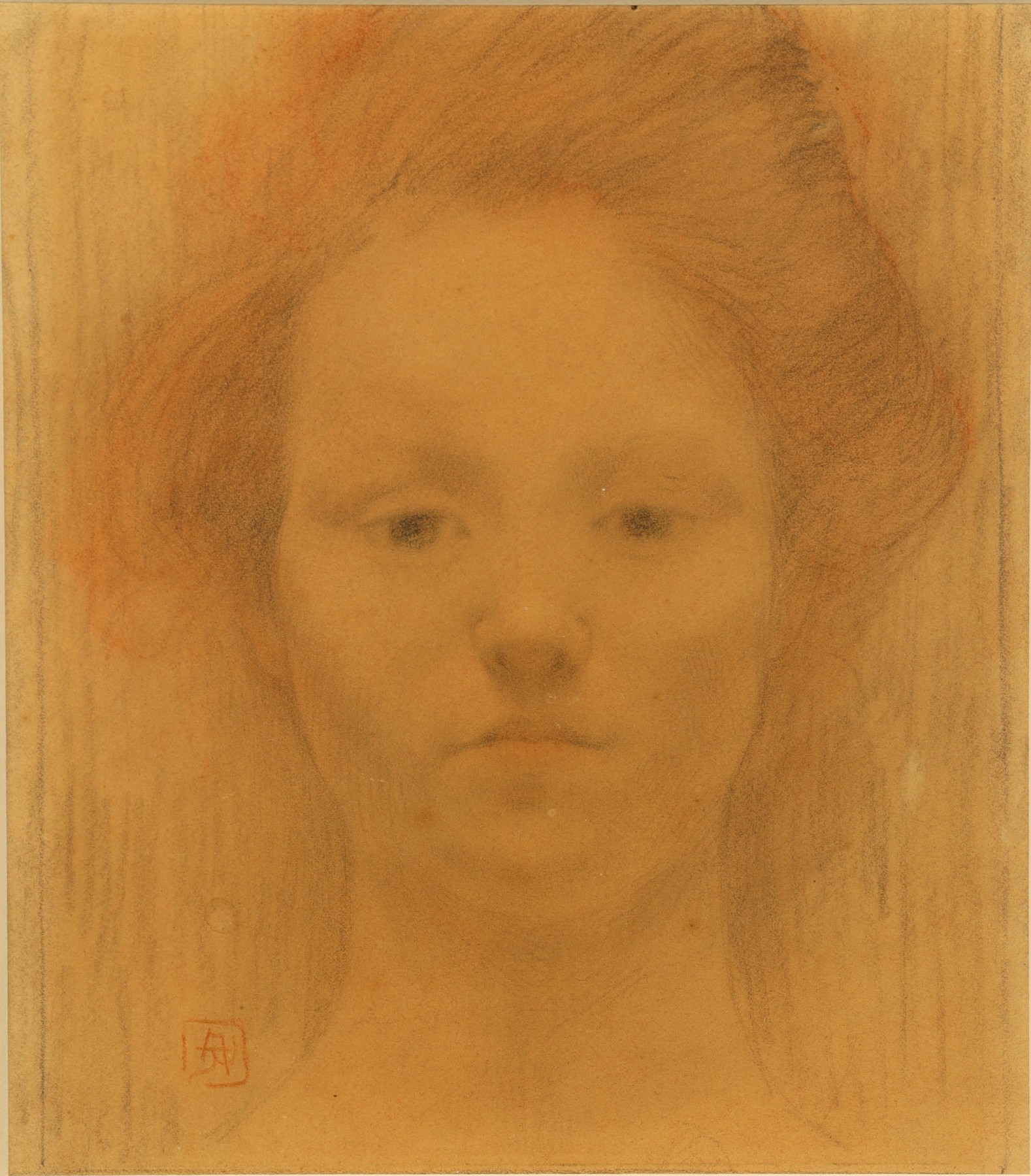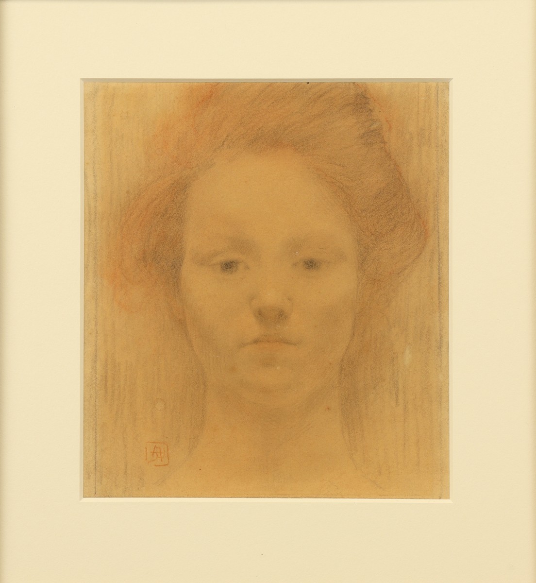 Dans ce portrait, Armand Rassenfosse affirme son attachement à la figure féminine, qu’il traite avec une grande sensibilité. Par un dessin précis et nuancé, il saisit un regard à la fois magnétique et énigmatique, conférant à l’ensemble une atmosphère empreinte de symbolisme.